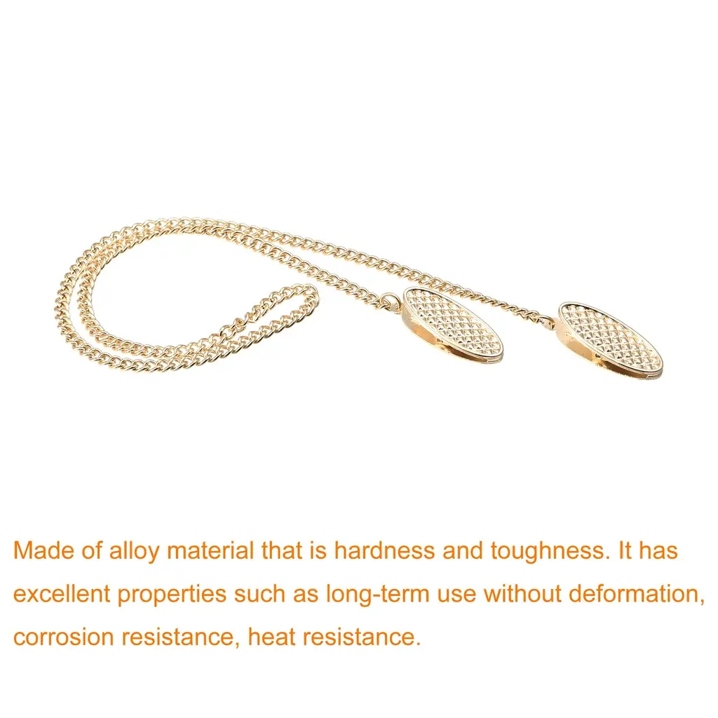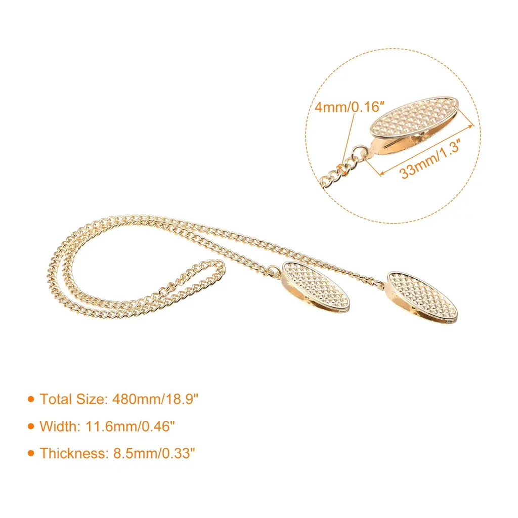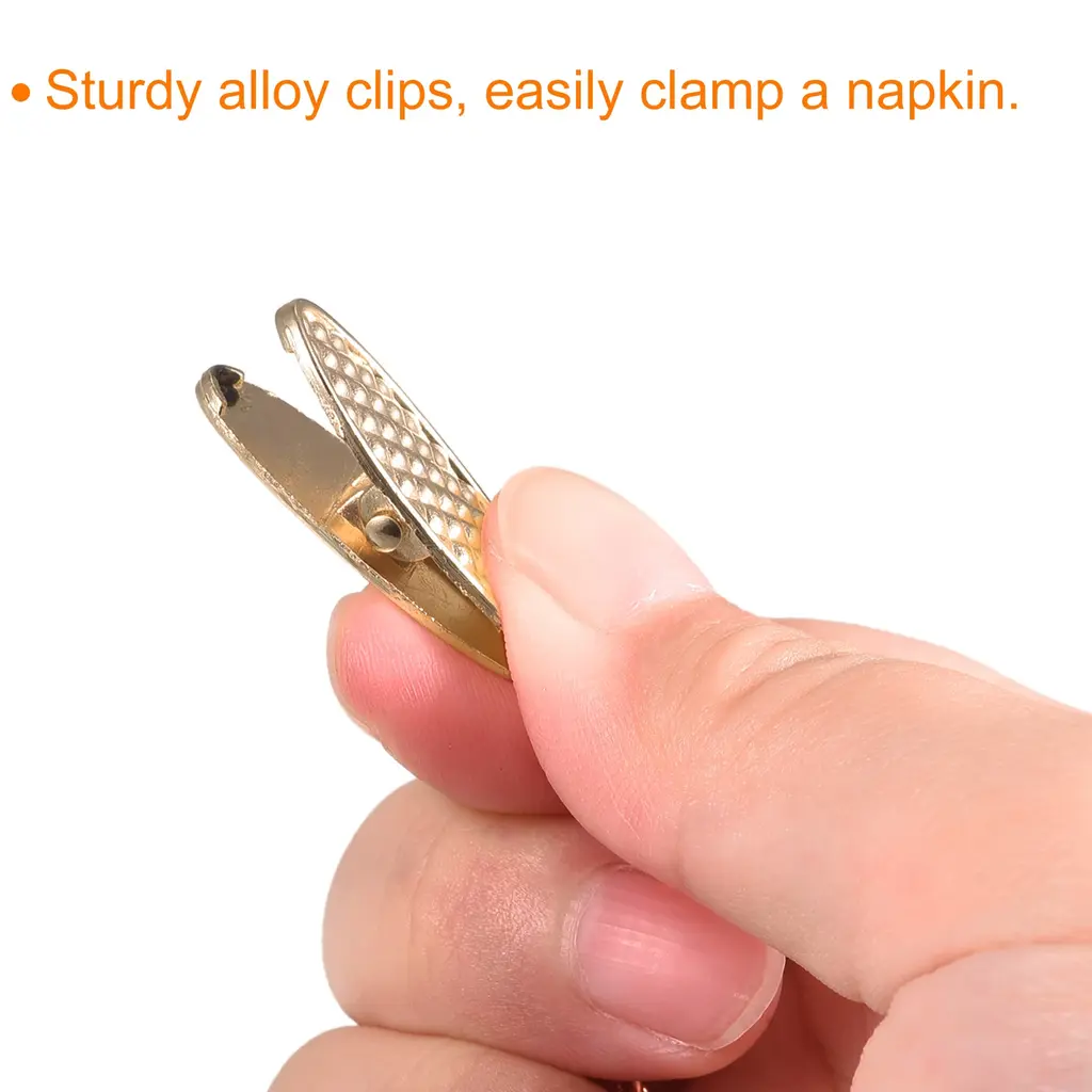 [Napkin Holder Chain] - Total Size: 480mm x 11.6mm x 8.5mm/18.9" x 0.46" x 0.33"(L*W*T); Clip Length: 33mm/1.3"; Chain Dia: 4mm/0.16"; Package Included: 1 Pcs x Napkin Holder Chains.[Material] - Made of alloy material that is hardness and toughness. It has excellent properties such as long-term use without deformation, corrosion resistance, heat resistance.[Features] - The bib holder chain provides fixed and windproof functions that keep the napkin stay in place and prevent it from moving away and falling off. The portable design helps you enjoy meal and workouts without dirt your clothes and affecting your movement.[Easy to Use] - This strap includes two sturdy alloy clips. You can easily clamp both sides of the clip onto a napkin or glasses.[Application] - Widely used to fasten the napkin around the neck when people of any age on birthdays, weddings, Valentine's Day, and Christmas at home or outside restaurants. Also, it can be used as a hat or cap lanyard to secure in sports or any action, such as sun hats, cowboy hats, baseball caps, flat caps, etc.Descriptions:Made of alloy material that is hardness and toughness. It has excellent properties such as long-term use without deformation, corrosion resistance, heat resistance.The bib holder chain provides fixed and windproof functions that keep the napkin stay in place and prevent it from moving away and falling off. The portable design helps you enjoy meal and workouts without dirt your clothes and affecting your movement.This strap includes two sturdy alloy clips. You can easily clamp both sides of the clip onto a napkin or hats.Widely used to fasten the napkin around the neck when people of any age on birthdays, weddings, Valentine's Day, and Christmas at home or outside restaurants. Also, it can be used as a hat or cap lanyard to secure in sports or any action, such as sun hats, cowboy hats, baseball caps, flat caps, etc.Product Specifications:Material: AlloyColor: BronzeTotal Size: 480mm x 11.6mm x 8.5mm/18.9" x 0.46" x 0.33"(L*W*T)Clip Length: 33mm/1.3"Chain Dia: 4mm/0.16"Package Included:1 Pcs x Napkin Holder Chains