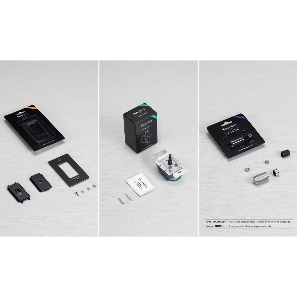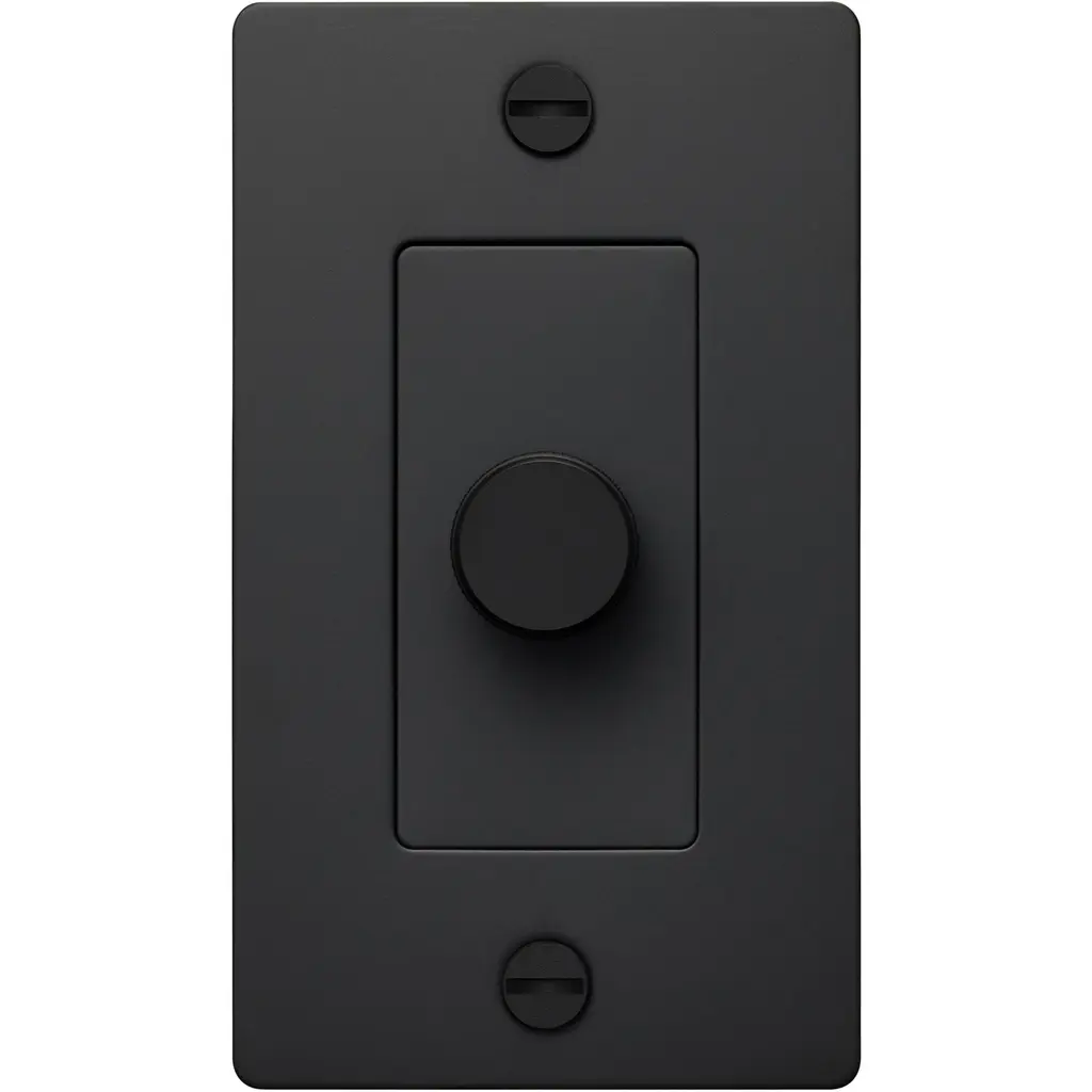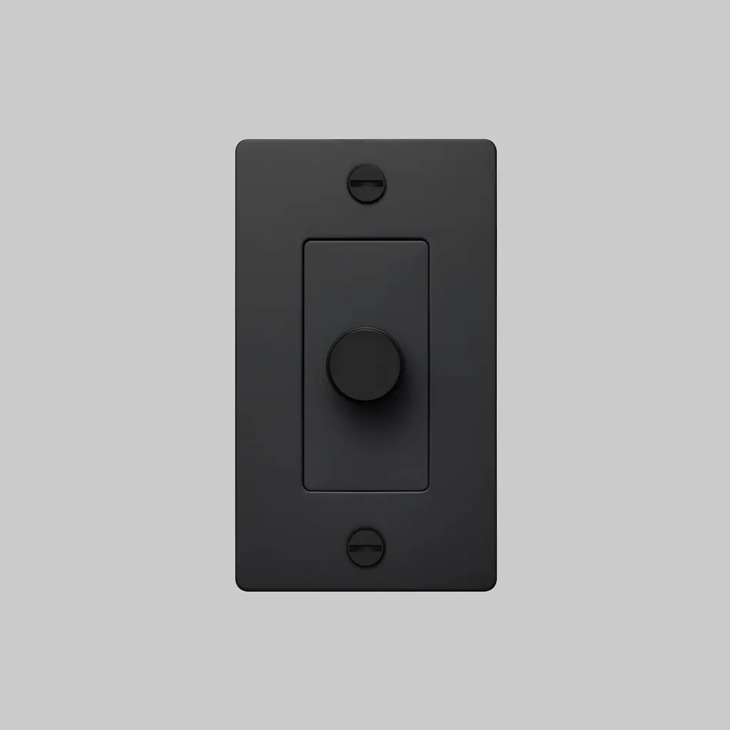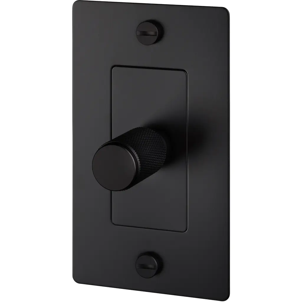 A dimmer switch finished in black. The dimmer knob features our signature, diamond-cut, cross knurl pattern and is made from solid black metal.