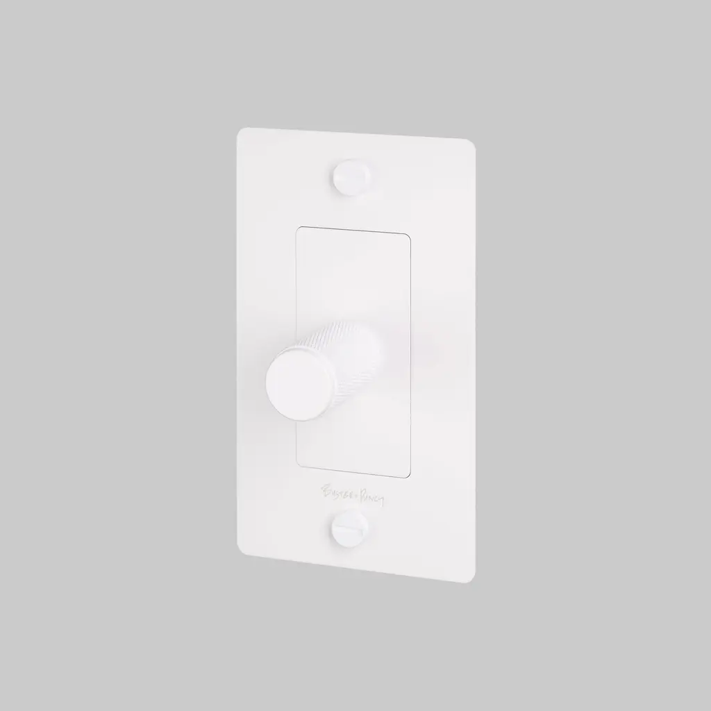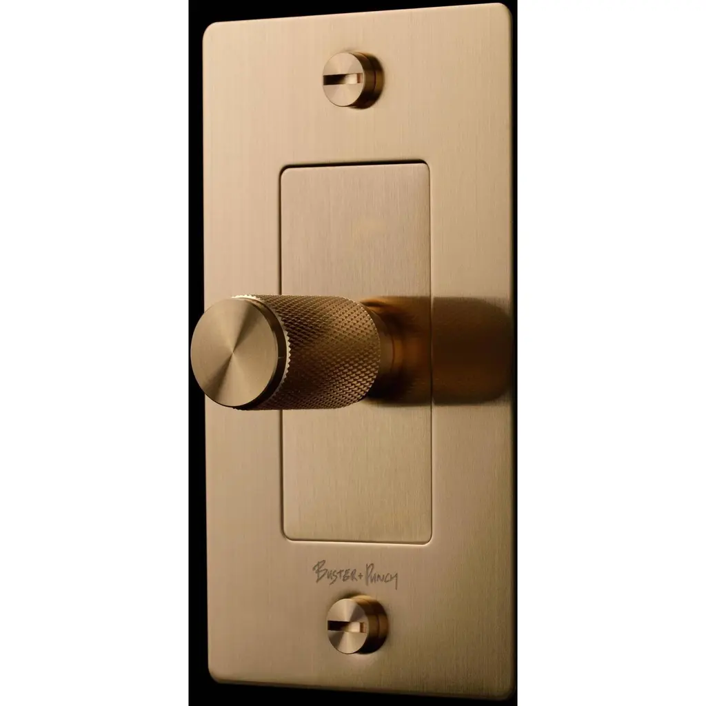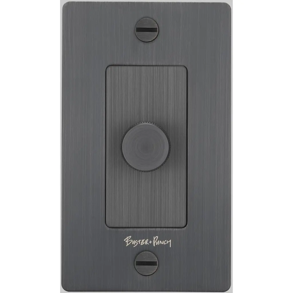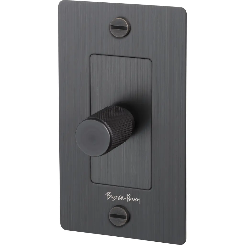 A dimmer switch finished in smoked bronze. The dimmer knob features our signature, diamond-cut, cross knurl pattern and is made from solid smoked bronze.