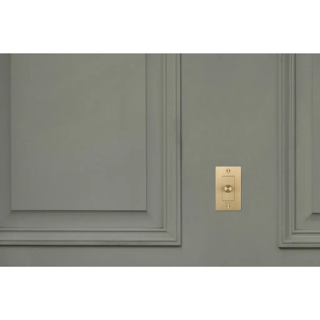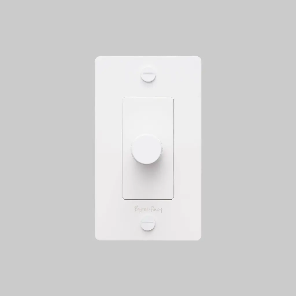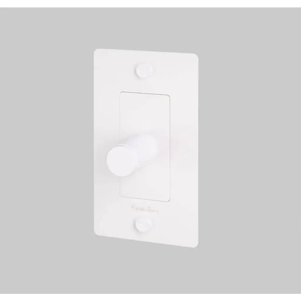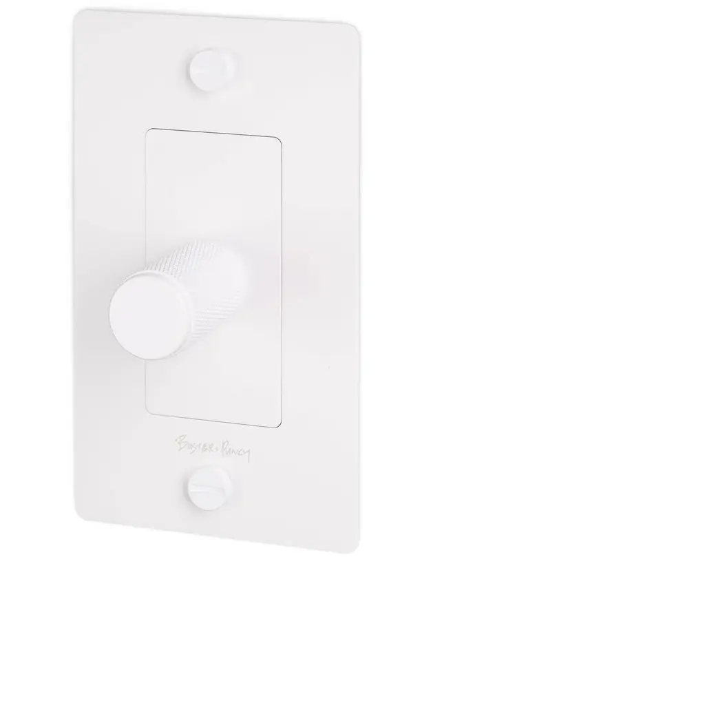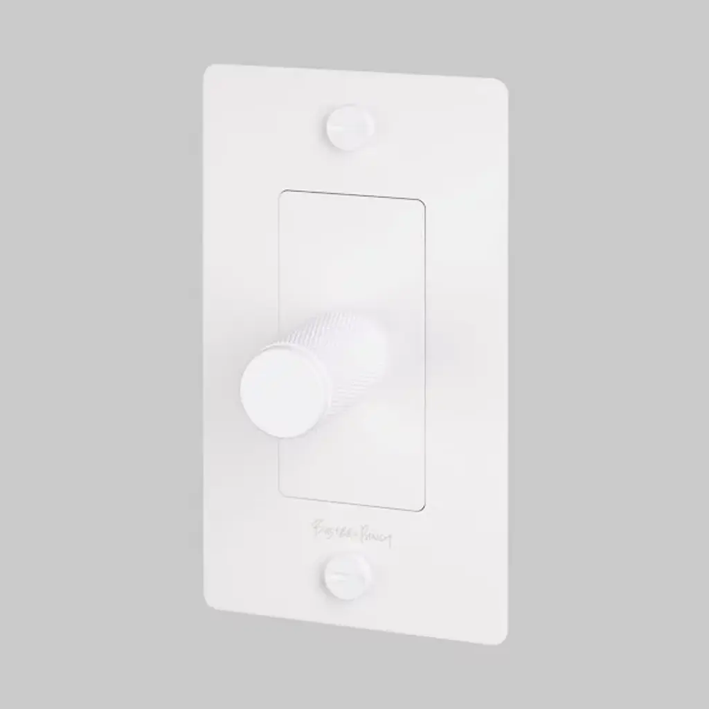 A dimmer switch finished in white. The dimmer knob features our signature, diamond-cut, cross knurl pattern and is made from solid white metal.