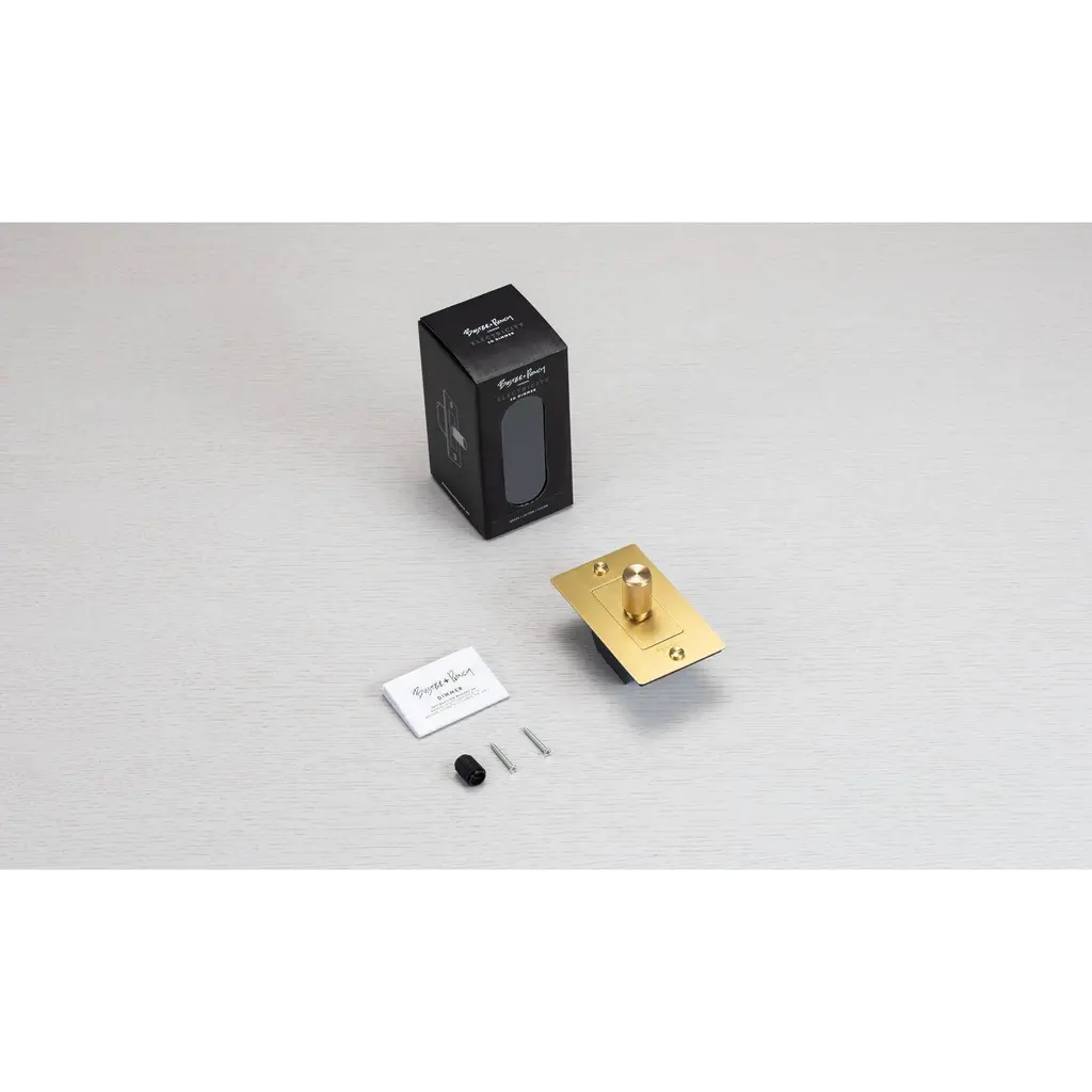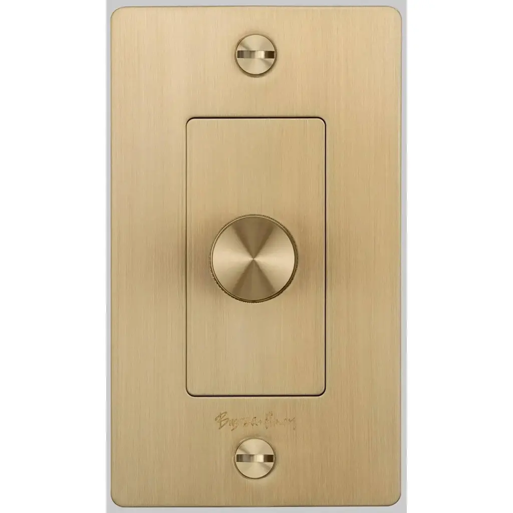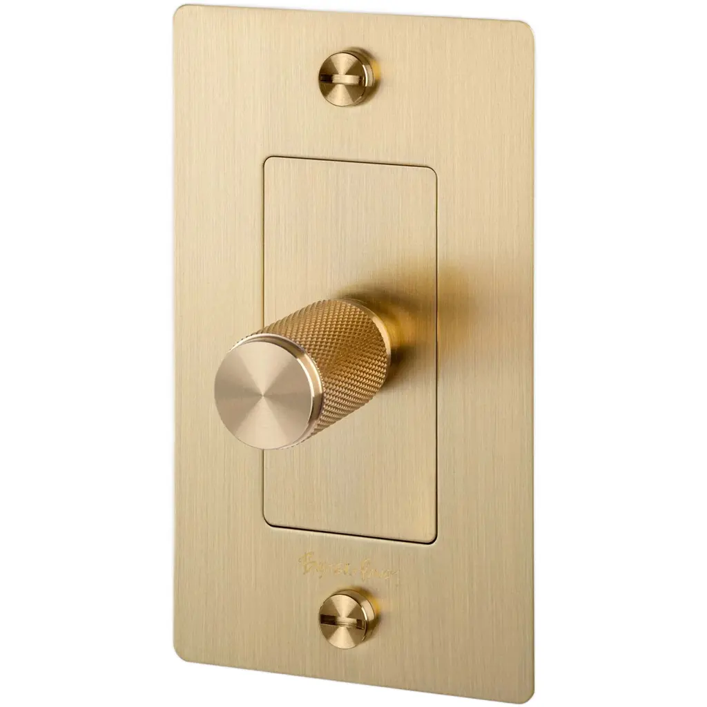 A dimmer switch finished in brass. The dimmer knob features our signature, diamond-cut, cross knurl pattern and is made from solid brass metal.FYI: This piece has a 4 mm shadow gap when installed.