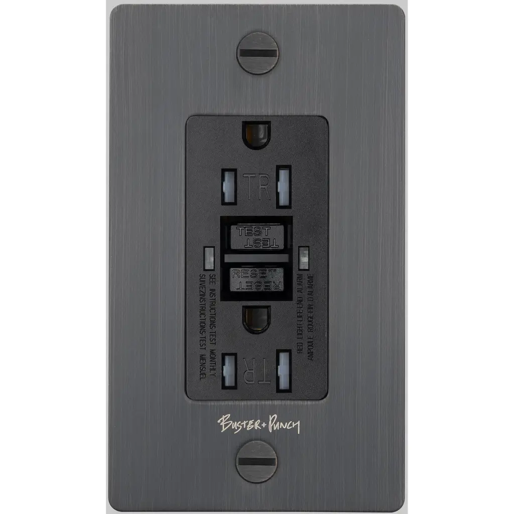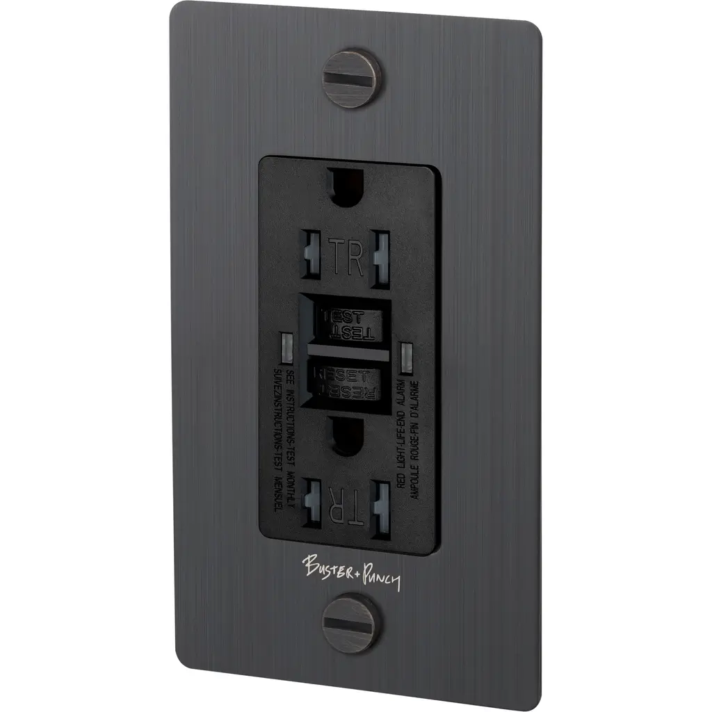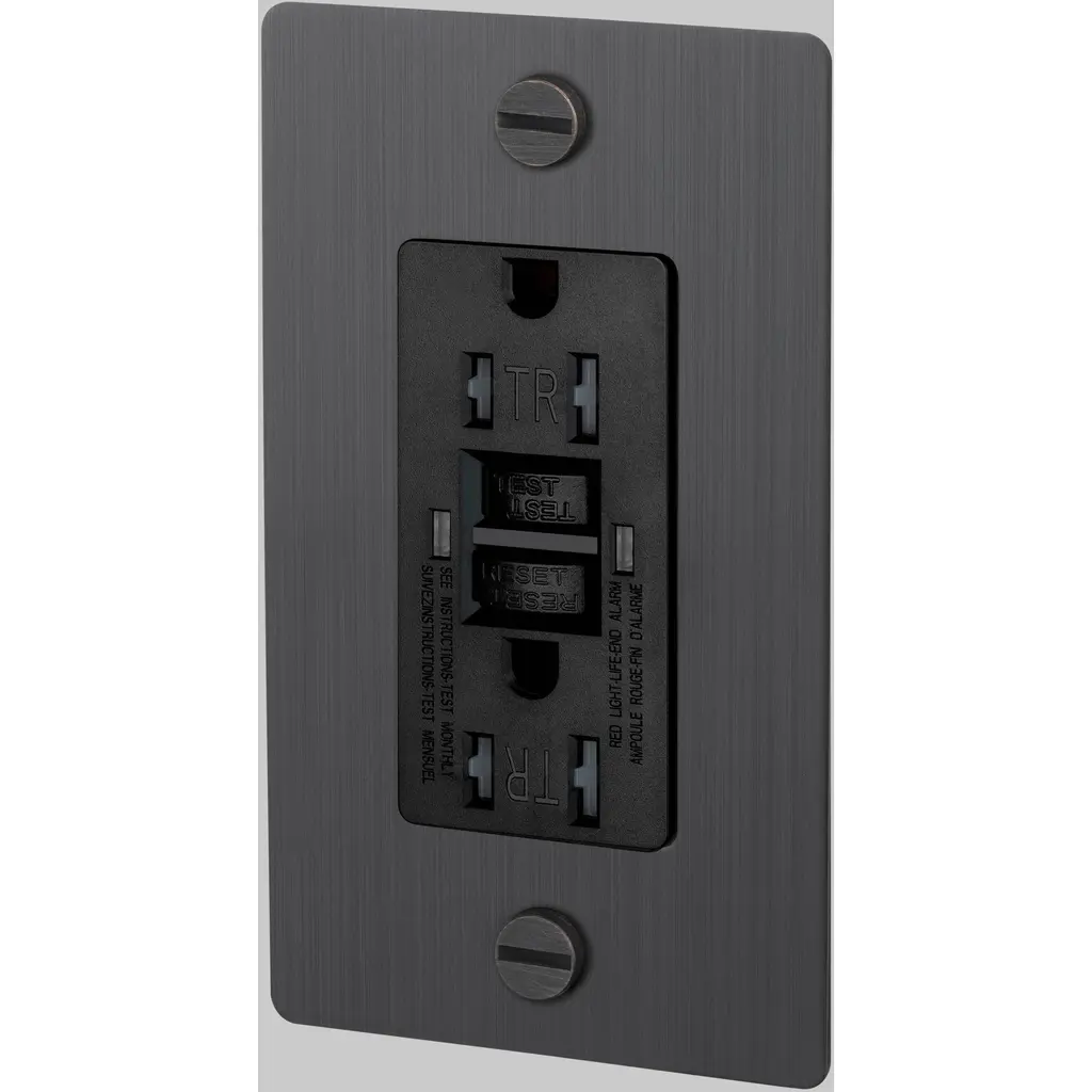 A GFCI outlet finished in smoked bronze and featuring our solid metal coin screws.FYI: This piece has a 4 mm shadow gap when installed.