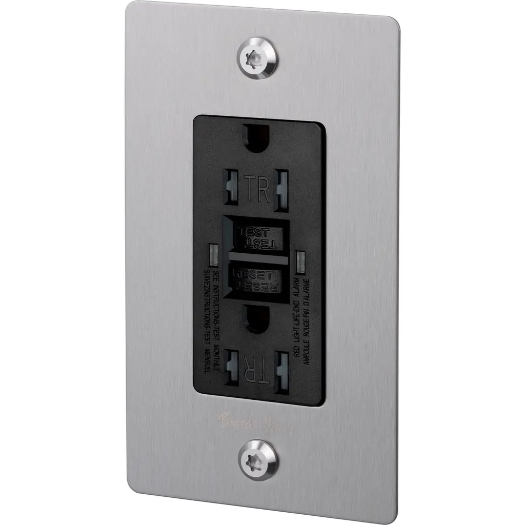 A GFCI outlet finished in steel and featuring our solid metal coin screws.FYI: This piece has a 4 mm shadow gap when installed.