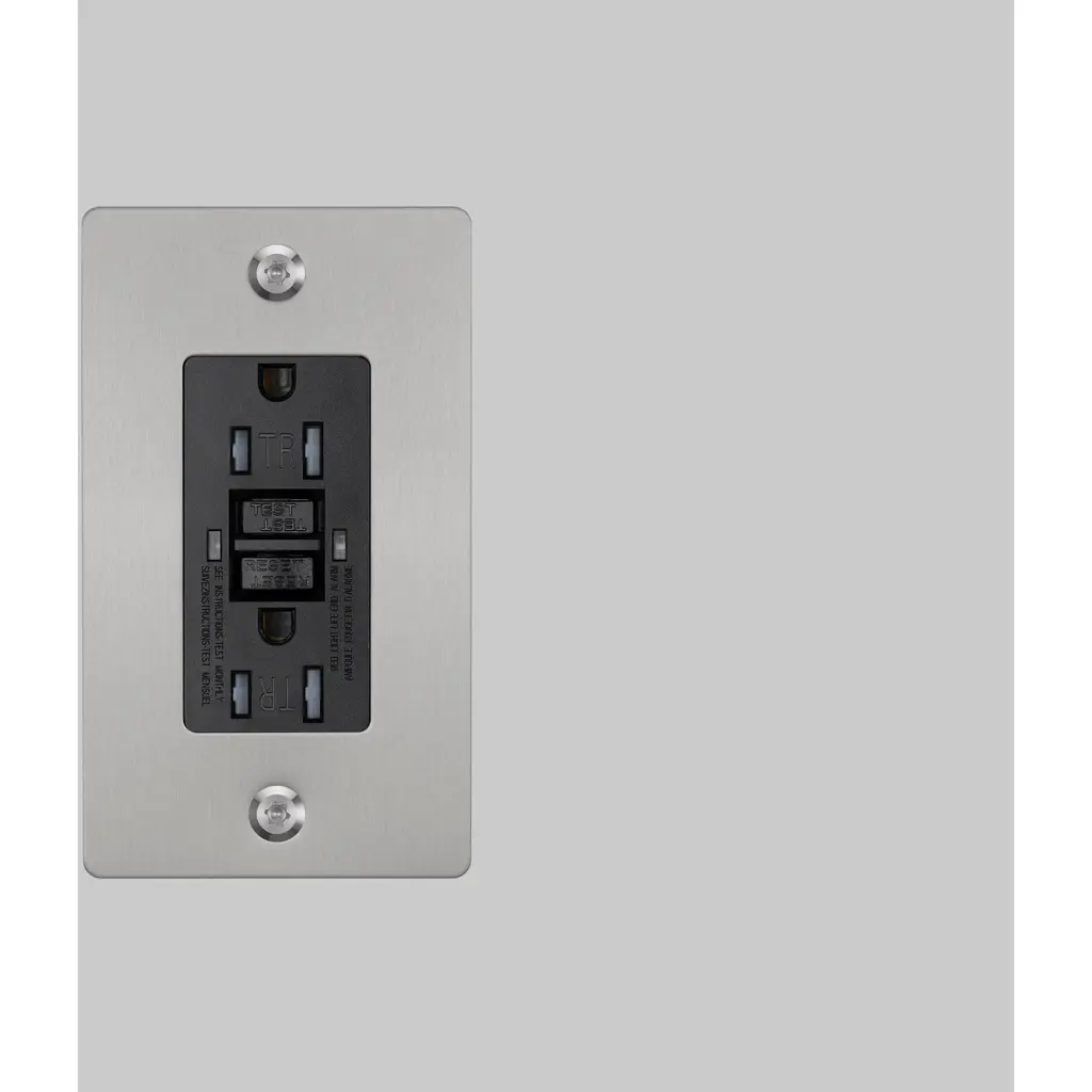 A GFCI outlet finished in steel and featuring our solid metal coin screws.FYI: This piece has a 4 mm shadow gap when installed.