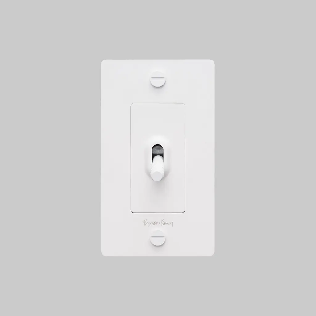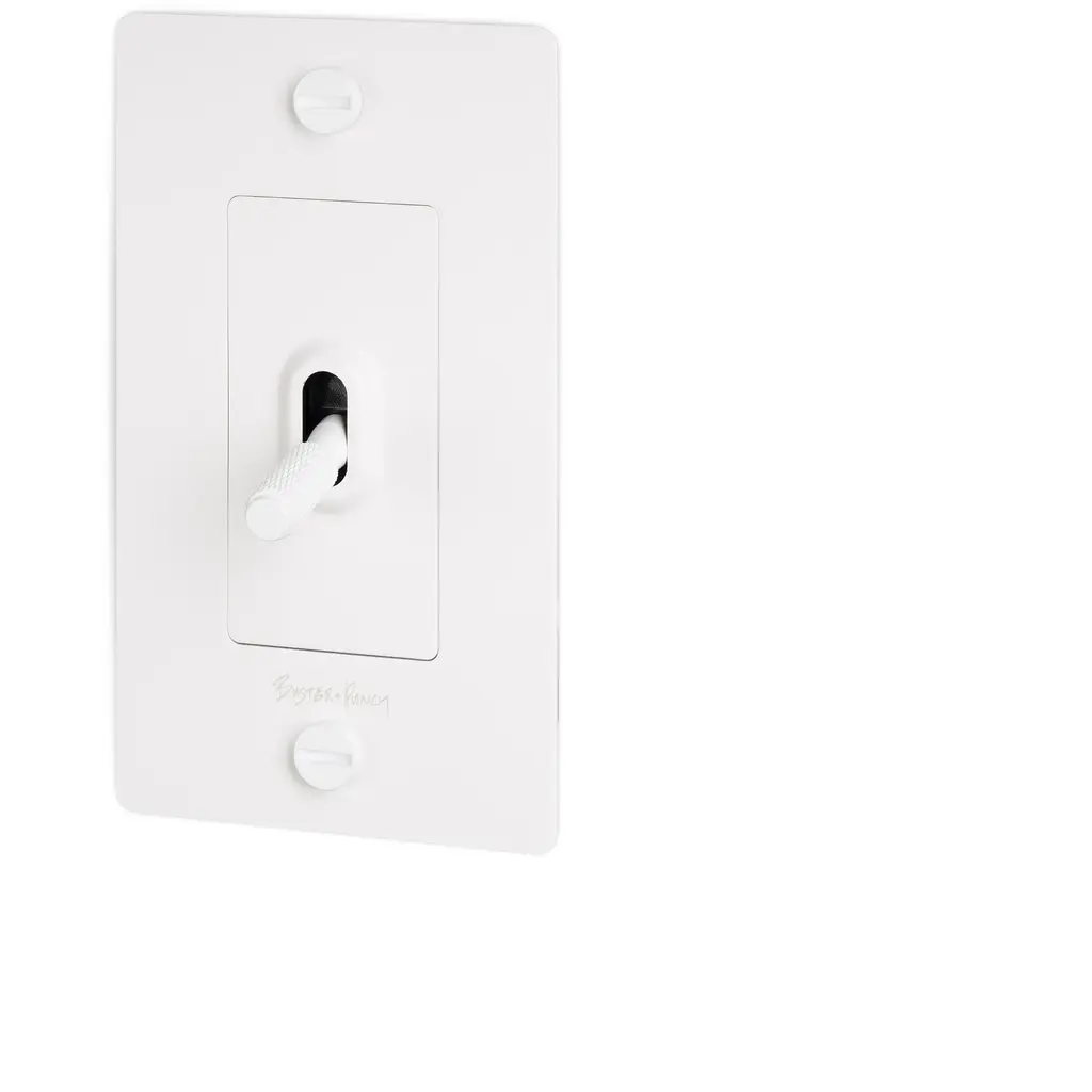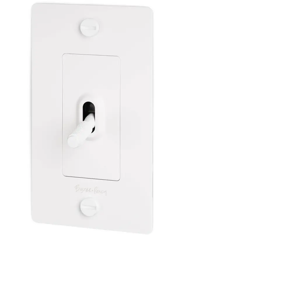 A toggle switch finished in white. The toggle arm features our signature, diamond-cut, cross knurl pattern and is made from solid white anodised metal.