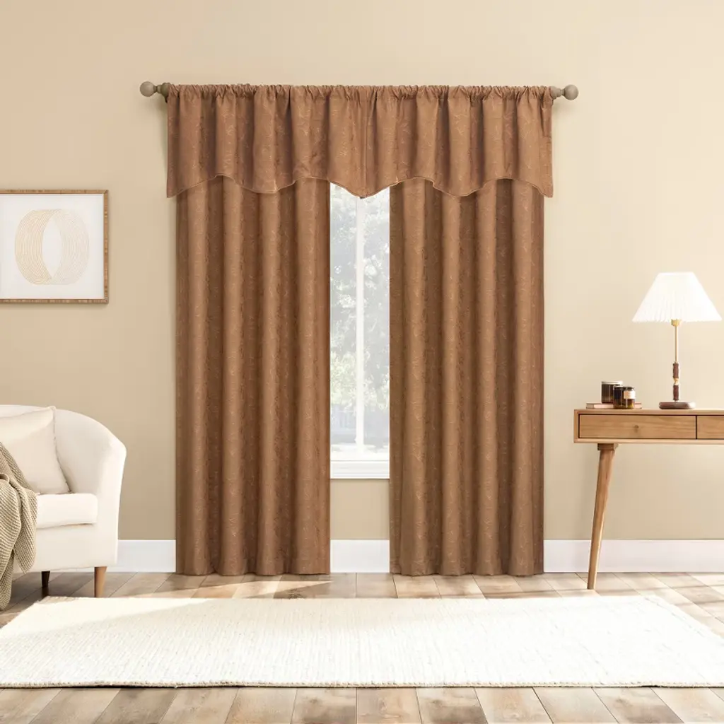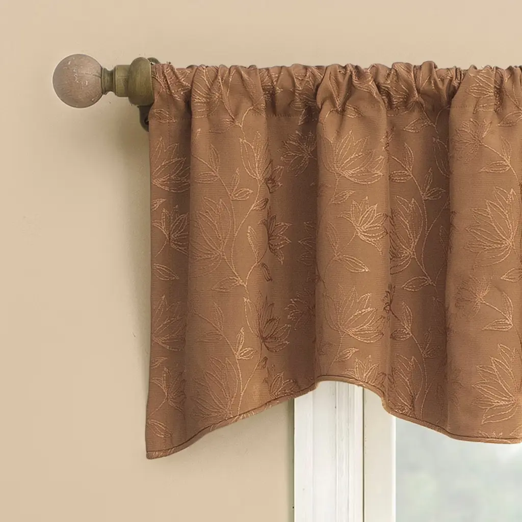 Add elegance to any room of your home with the embroidered botanical floral jacquard design of Bronte Curtain Valances from Sun Zero. Total Blackout technology blocks out 100% of outside light. Built-in rod pocket fits curtain rods up to 1.5" in diameter. Valances sold individually. Measure carefully prior to purchase. Sold as individual valances measuring 50" width by 18" length in color terracotta. Coordinating curtain panels are sold separately. Measure carefully before selecting your desired size and quantity. Rod not included. Machine wash cold on gentle cycle. Use only non-chlorine bleach when needed. Tumble dry on low heat, using a cool iron as needed.