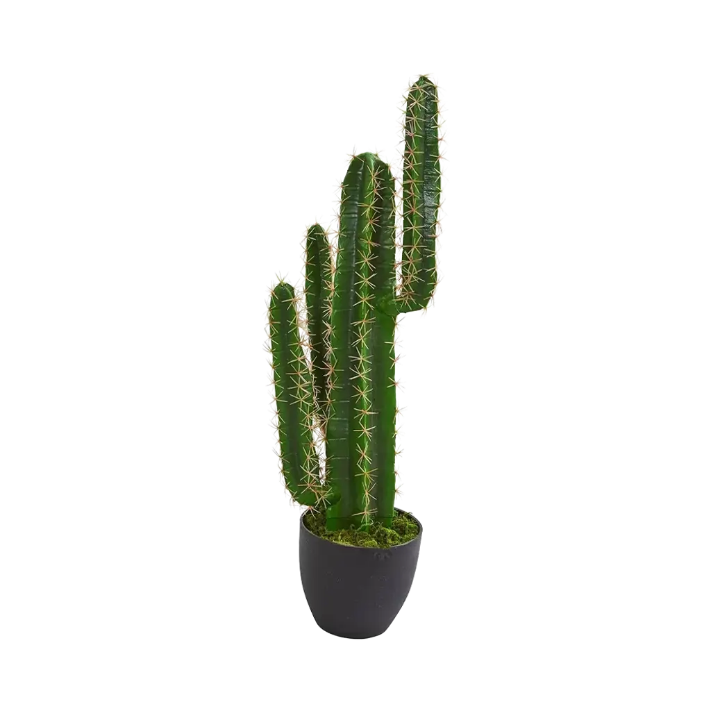 The 2.5 ft. Azure Spire Cactus is a lifelike masterpiece, featuring vibrant green spiky stems, elegantly presented in a sleek black pot. This striking arrangement brings a touch of desert charm and modern flair to any space.