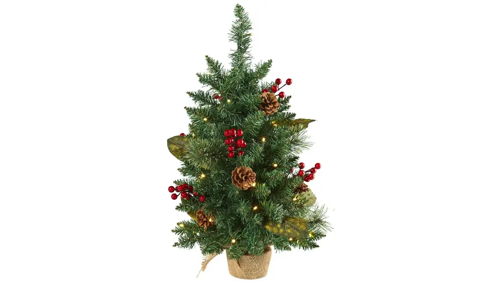 Transform your home into a festive wonderland with this artificial Christmas tree. Featuring pine foliage, faux pinecones, and red berries, it's pre-strung with LED lights and contains 162 tips for holding your favorite ornaments. Battery operated and perfect for small spaces, this tree will be a cherished addition to your holiday decoration for years to come. Product Features: Pre-lit with 35 clear LED lights Bulb size: wide angle Bulb type: LED 162 tips Accented with pine foliage, faux pinecones, and red berries Assembled in the USA Care instructions: wipe clean with a soft dry cloth Additional Product Features: LED lights use 90% less energy Bulbs stay cool to the touch Light sets on tree are UL certified and approved for indoor or outdoor use, however the tree itself is recommended for indoor use only If one bulb burns out, the rest will stay lit Requires 3 "AA" batteries - not included No assembly required – tree comes in 1 piece Dimensions: 2’ high (from the base of the stand to the top of the tree) 11” base diameter (at the widest point) Material(s): polyvinyl chloride Note:Item will need to be reshaped when removed from the box