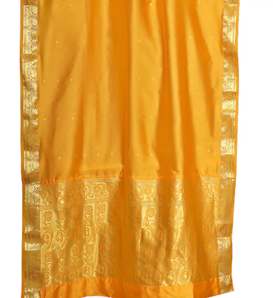 We offer this vibrant color gold zari motif Sari Curtains. They inject warm and rich color to your space and make a bold statement.If you've been looking for amazing window treatments, here you have found a vast selection of bright colors, dazzling and light material that will look great all year round. Sari Curtains / Drapes / Panels are the perfect choice for those looking for light, elegant drapes with a touch of luxury. It has smooth finish with a soft sheen and feels gentle and cool to the touch. Sheer curtains made of saris allow light in through windows but prevent people looking in when they are drawn. Story Behind the Art: The fabric of these curtains are weaved on a hand-loom in a small rural village in India and then hand-dyed. The artisans are a group of young hand-crafters who have moved from small villages to a big town in Central India and make various home decor items out of these exotic sari fabrics. This gives these wonderful artisans a way to have sustainable income via selling to the worldwide market on the internet. Your purchase supports local and home-based work where the artisans can easily tend to their families and pass these time-honored skills from one generation to the next.