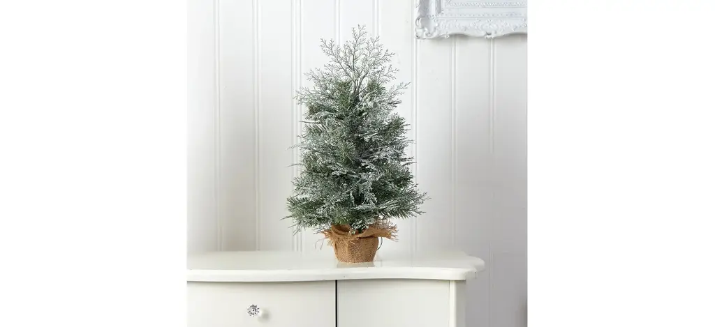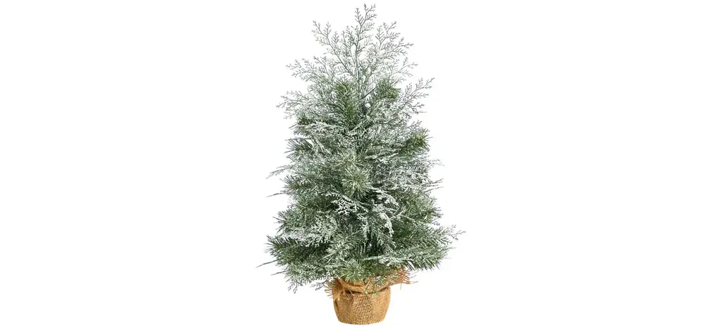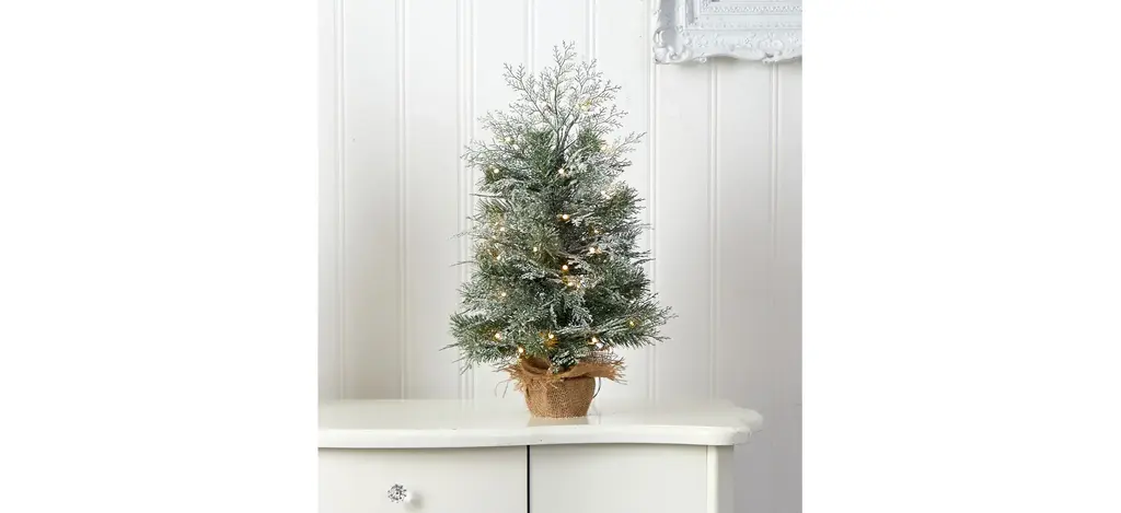 Spread Christmas cheer to compact spaces with this 2" Frosted Artificial Christmas Tree with LED Lights in Burlap Base. Inspired by nature and crafted from high-quality materials, this mini Christmas tree has lifelike bendable branches, allowing you to shape in your space, and add mini ornaments. To save you time and money, the faux tree comes with 35 LED lights for a cozy glow, allowing you to illuminate any space for years to come. Your artificial Christmas Tree will look beautiful for years to come; simply wipe clean with a soft dry cloth when needed.
