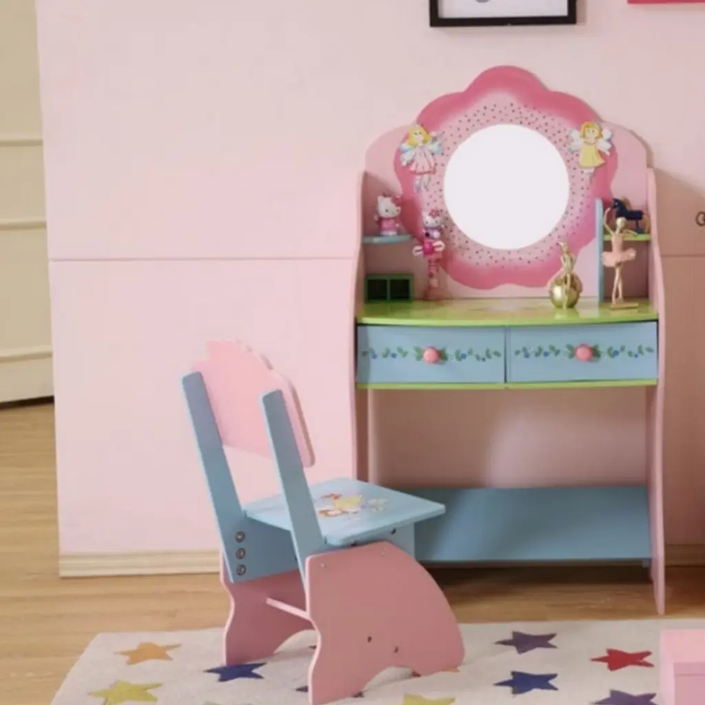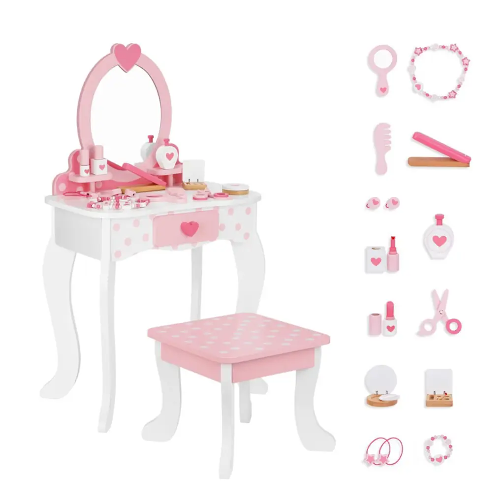 Specifications:Key Features:● Ideal Gift for Little Girls: Featuring stylish shape and watermelon patterns, the kids vanity table set will be an ideal birthday or festival gift for kids. With 23" tabletop height, it's suitable for toddlers over 3 years old to use. Plus, it also comes with 1 hair band, 2 hair loops and 4 hair barrettes for kids to dress up.● 2-in-1 Kids Vanity Table: The kids dressing table is designed with a beautiful silver mirror, which can be removed when not in use. Therefore, the table can be used as a vanity table or a study desk, which will satisfy kids' need of making up, drawing or writing.● Practical Storage Space: The spacious tabletop and large storage drawer provide your little one with sufficient storage space to place their trinkets, books or other items. On the other hand, the matching stool can also be stored underneath the table to save space.● Safe and Stable Structure: The anti-toppling device helps to secure the table to the wall for safety. Stable curved legs, reinforced structure and non-slip foot pads guarantee overall sturdiness. Meanwhile, certified by ASTM and CPSIA, the vanity table set with rounded corners is safe for kids to use.● Simple Assembly and Dimension: Detailed user manual and all needed accessories allow you to conveniently and quickly assemble the vanity table and stool.