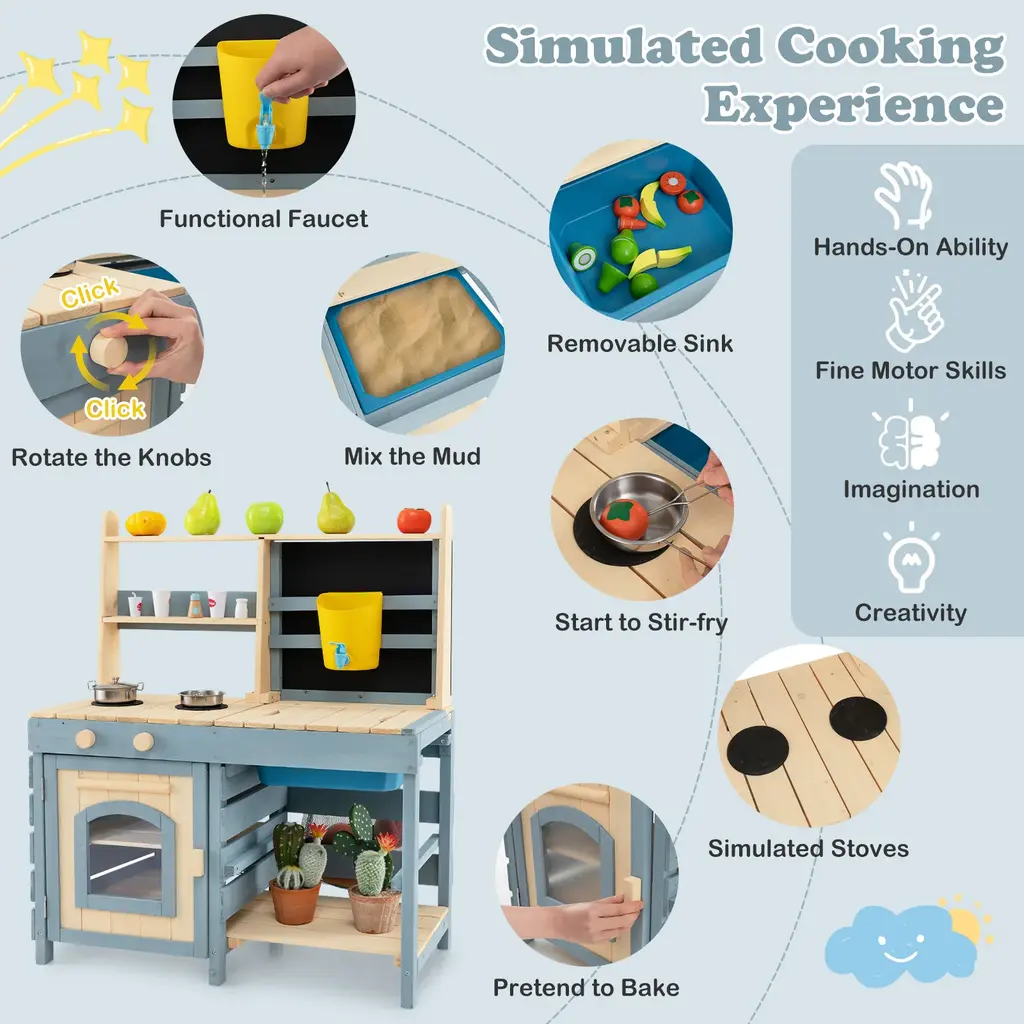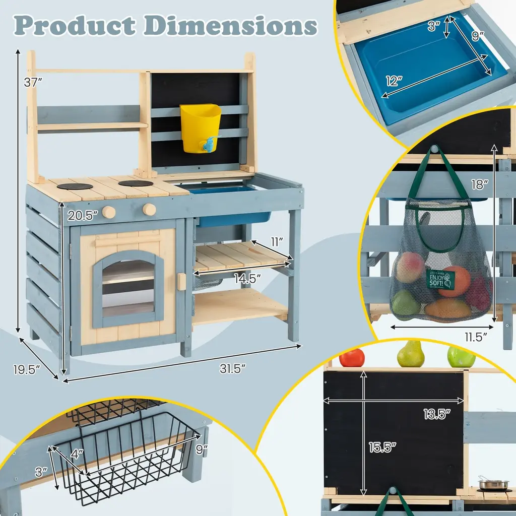 Specifications:Description:This kids’ outdoor mud kitchen and grocery store set offers endless fun with a front mud kitchen featuring 2 simulated stoves, a functional faucet, a removable sink, and an oven for realistic cooking play, while the back side serves as a grocery store with a chalkboard for menu writing. The rotary knobs create realistic clicking sounds, and the transparent window lets kids observe the cooking process. Made from durable fir wood with rounded corners for safety, this playset includes abundant storage options with shelves, a storage bag, and metal baskets for organizing accessories. Ideal for children ages 3-8, it promotes creativity, motor skills, and imaginative play.Key Features:● Mud Kitchen and Grocery Store: The front side is a mud kitchen with 2 simulated stoves, functional faucet, removable sink, and realistic oven for immersive cooking game. Besides, the back side is a grocery store for imaginative selling and shopping experience. Kids can write menu on the large chalkboard.● Simulated Cooking Experience: Your little one can rotate the knobs, start to stir-fry, mix the mud, and pretend to bake like a real chef. The rotary knobs create clicking sounds. Plus, the transparent window allows kids to see the inside kitchen toy.● Selected Fir Wood Material: This kids kitchen playset boasts a natural fir wood frame to make it durable and sturdy. Rounded corners protect kid's delicate skin from scratches. ● Abundant Storage Space: Our mud kitchen comes with 1 top shelf, 1 middle shelf, 1 bottom shelf, 1 storage bag, and 2 metal baskets to place all accessories. The detachable sink cover can also be used as a movable shelf. It helps kids develop a good habit of sorting out.● Ideal Gift for Your Toddlers: Our kids outdoor mud kitchen is specially designed for 3-8 years old kids to play. 20.5" countertop height enables kids to easily reach for different accessories. It helps kids improve their hands-on ability, fine motor skills, creativity, and imagination.