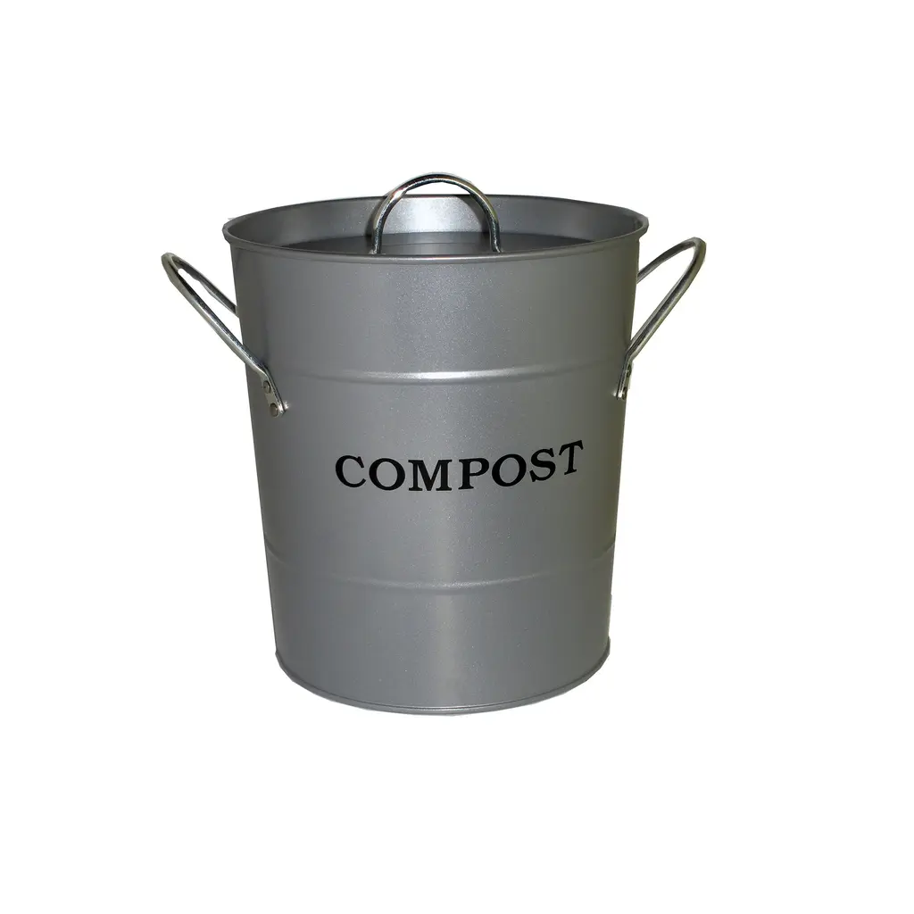 2-N-1 Metal Kitchen Bucket One gallon capacity is a stylish and perfect size to sit on the kitchen counter to collect kitchen scraps for composting.
