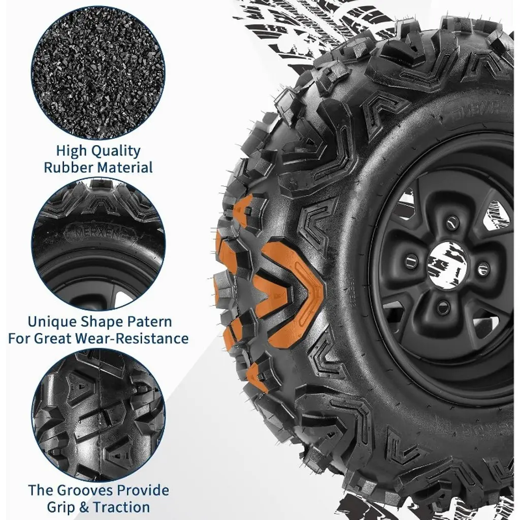 Hit the Trails With Confidence - Built for Family Fun & Tough Jobs Picture this: You're halfway through a weekend trail ride with the kids when you hit an unexpected patch of jagged rocks. With these 6-ply reinforced tires, you power through without a second thought - no worrying about punctures ruining your family adventure. That's the peace of mind these complete wheel and tire sets deliver, whether you're exploring backcountry trails or hauling feed across muddy pastures. The secret's in the smart design. Those A-shaped tread blocks? They dig into loose sand so you don't get stuck, while shedding thick mud effortlessly. Farmers appreciate how they handle heavy loads during chores, while weekend riders love the stable cornering when the kids beg for "just one more lap" around the property. Unlike standard tires that wear quickly, the durable matte black wheels stay looking sharp season after season, resisting scratches from branches and brush.