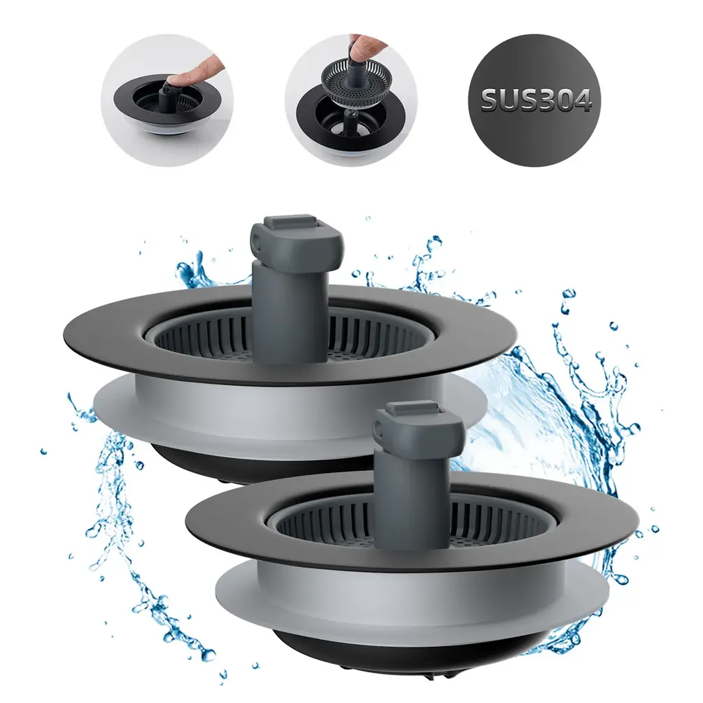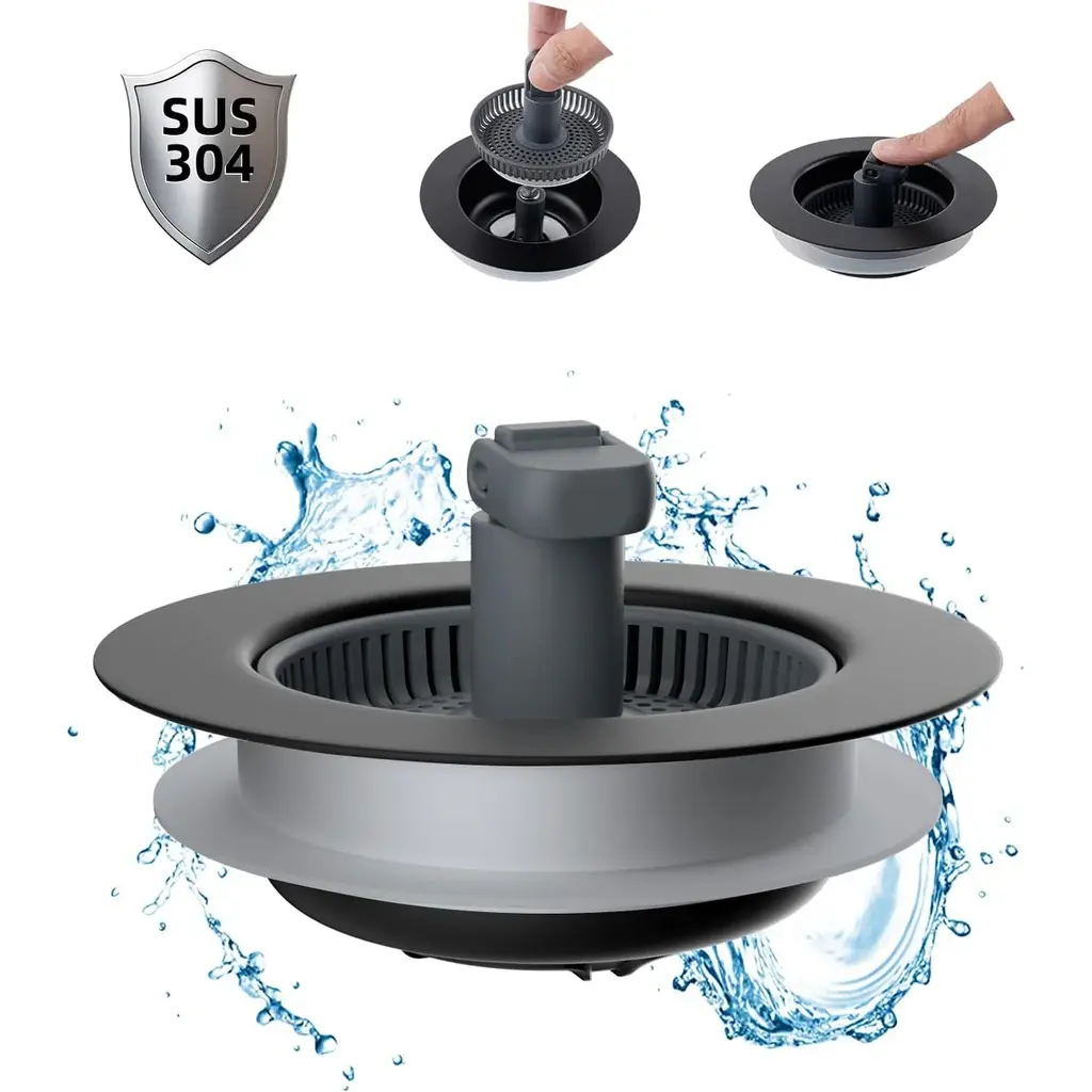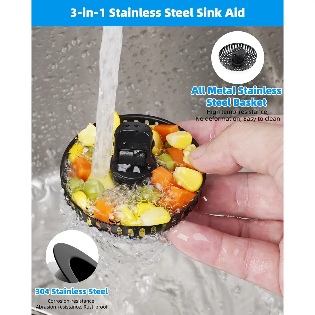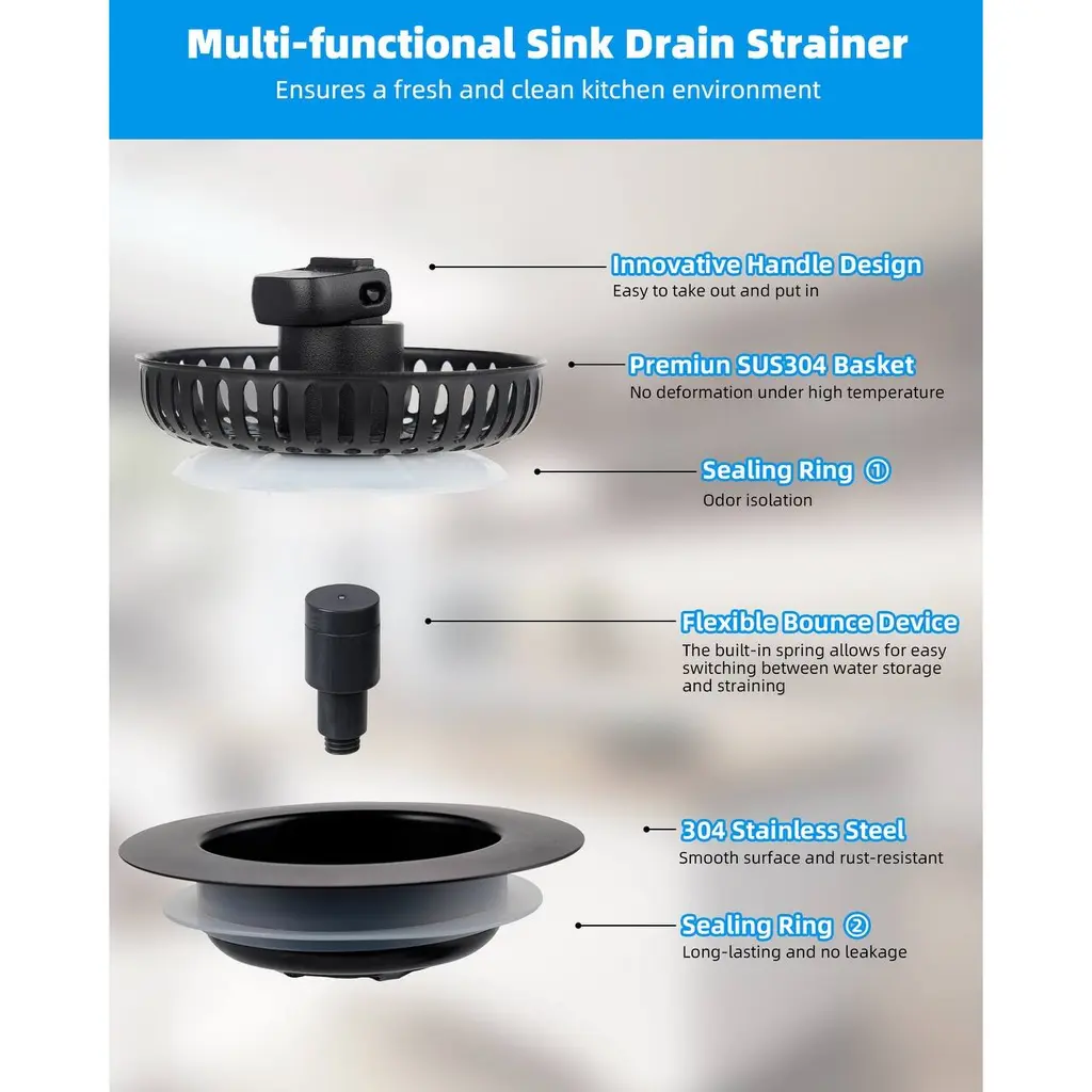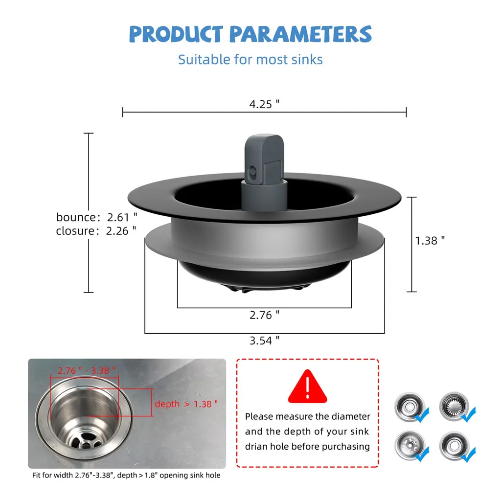 Stainless Steel 3 in 1 Kitchen Sink Drain Strainer, Drain Stopper Combo, Pop Up Sink Stopper, Anti-Clogging Metal Basket Strainer with Handle for US Standard 3-1/2" Drain Premium Materials - This kitchen sink drain strainer is constructed with a 304 stainless steel body and metal basket, incorporating a flexible bounce device and an upgraded foldable handle design. Stainless steel is highly resistant to rust and scratches, ensuring a seamless fit with no gaps in your sink. The polypropylene basket is made of food-safe material, which is lightweight, heat-resistant, and easy to clean, making it a reliable and long-lasting addition to any kitchen.Universal US Standard Sink Size - This kitchen sink stopper is suitable for width 2.76"-3.38", depth>1.8" opening sink hole. It can fit US Standard 3-1/2 inch drain. Please do measure the diameter and the depth of your sink drain before purchasing. For any inquiries or issues, our responsive and knowledgeable customer service support is available to assist you.Versatile 3-in-1 Design - This sink strainer combines water storage, strainer and odor isolation. With multi-layer sealing gaskets, this sink stopper ensures leak-proof water storage while effectively isolating kitchen drain odors. It can be used to fill the sink with water for cleaning and soaking purposes. The perforated basket allows easy filtration of kitchen waste without impeding water flow, which can easily captures food, waste and debris to prevents clogging in kitchen pipe.Upgraded Pop-up Stopper & Drain Quickly - The pop up kitchen sink drain stopper is equipped with upgraded one-piece spring-loaded design. With just one press, you can easily switch between water storage and fast drainage strainer. Responsive bounce design for effortless pressing which is suitable for various settings including kitchens, restaurants, hotels, and canteens etc.Foldable Handle & Anti-clogging SUS304 Basket - Our Innovative kitchen sink filter has a easy carrying handle for effortless basket removal and installation. Appropriate basket hole can easily filters kitchen leftovers without clogging the basket holes, effortless disposal of sink waste without getting hands dirty. Waterproof and oil-resistant PP material allows for easy cleaning and maintain, saving you time and effort, simplifies maintenance tasks and ensures a fresh and clean kitchen environment.