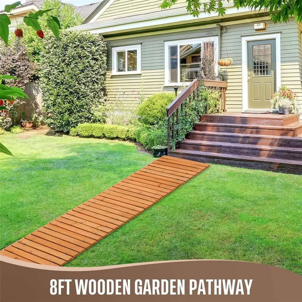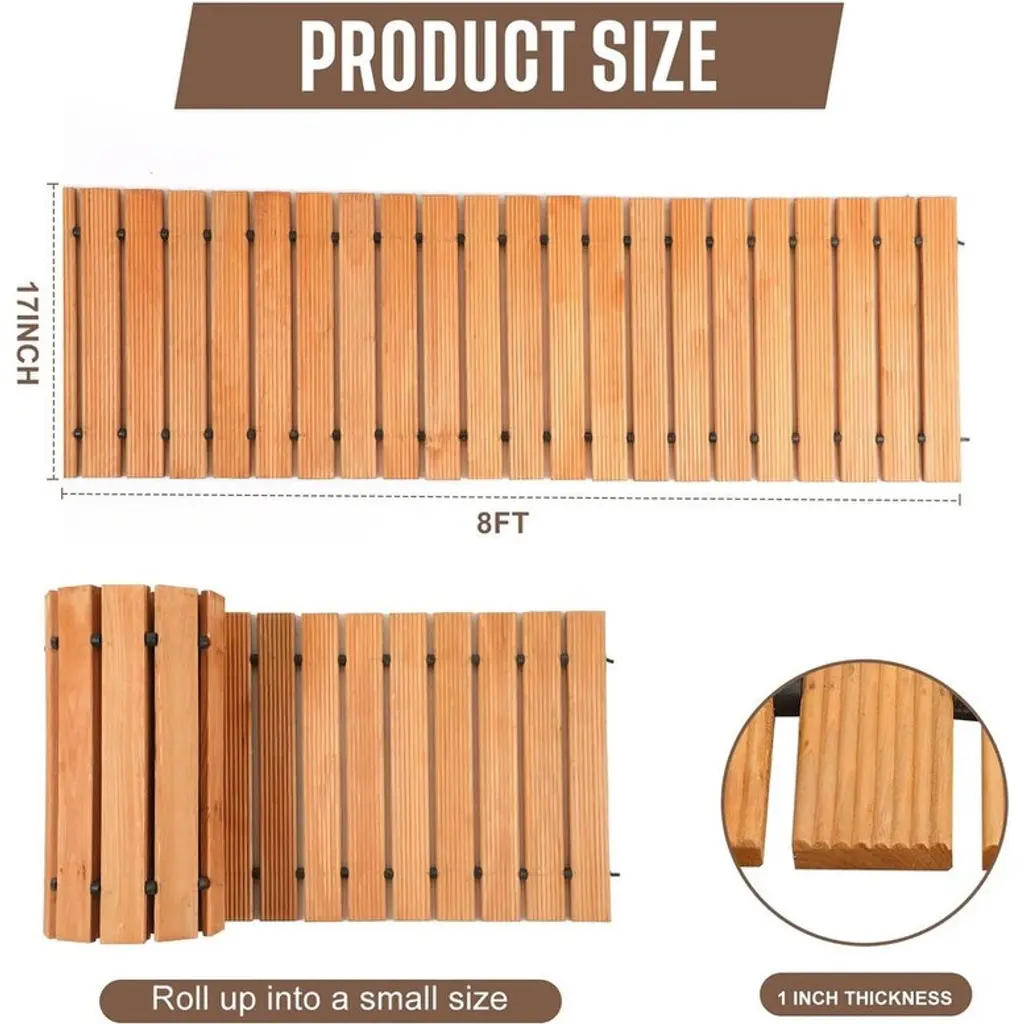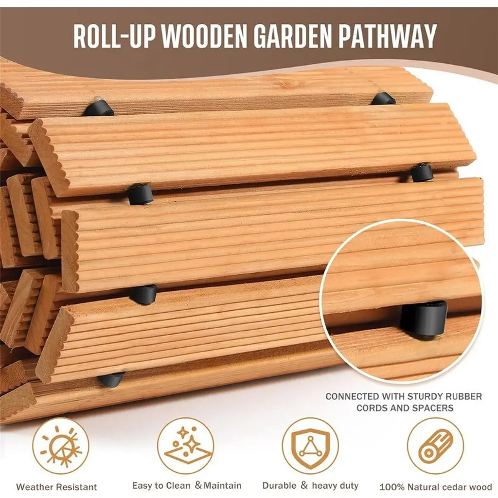 1. **Generous Size for Spacious Walkways**: This wooden garden pathway comes in two pieces, each measuring 8 feet in length and 17 inches in width. It provides ample space for walking and adds a beautiful decorative element to your garden. 2. **High-Quality and Weather-Resistant Cedar**: Made from pressure-treated cedar planks, this pathway is sturdy and resistant to weather, UV damage, and deformation. It is designed to withstand different seasons while providing a non-slip surface for safety. 3. **Secure and Durable Connection**: The planks are connected by two rows of anti-rust steel wire ropes and high-density rubber spacers, offering a more reliable and long-lasting connection compared to other materials. This ensures a strong, durable structure. 4. **Space-Saving and Easy to Clean**: The roll-up design makes it easy to store when not in use. Simply roll it up and save space. For cleaning, just rinse it with water, making maintenance effortless. 5. **Versatile Outdoor Use**: Ideal for gardens, patios, backyards, and even events like weddings or BBQs, this pathway keeps your feet dry and clean from dirt, mud, and sand, while also enhancing the aesthetic of your outdoor space.