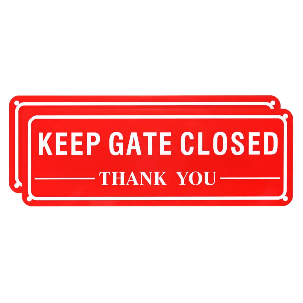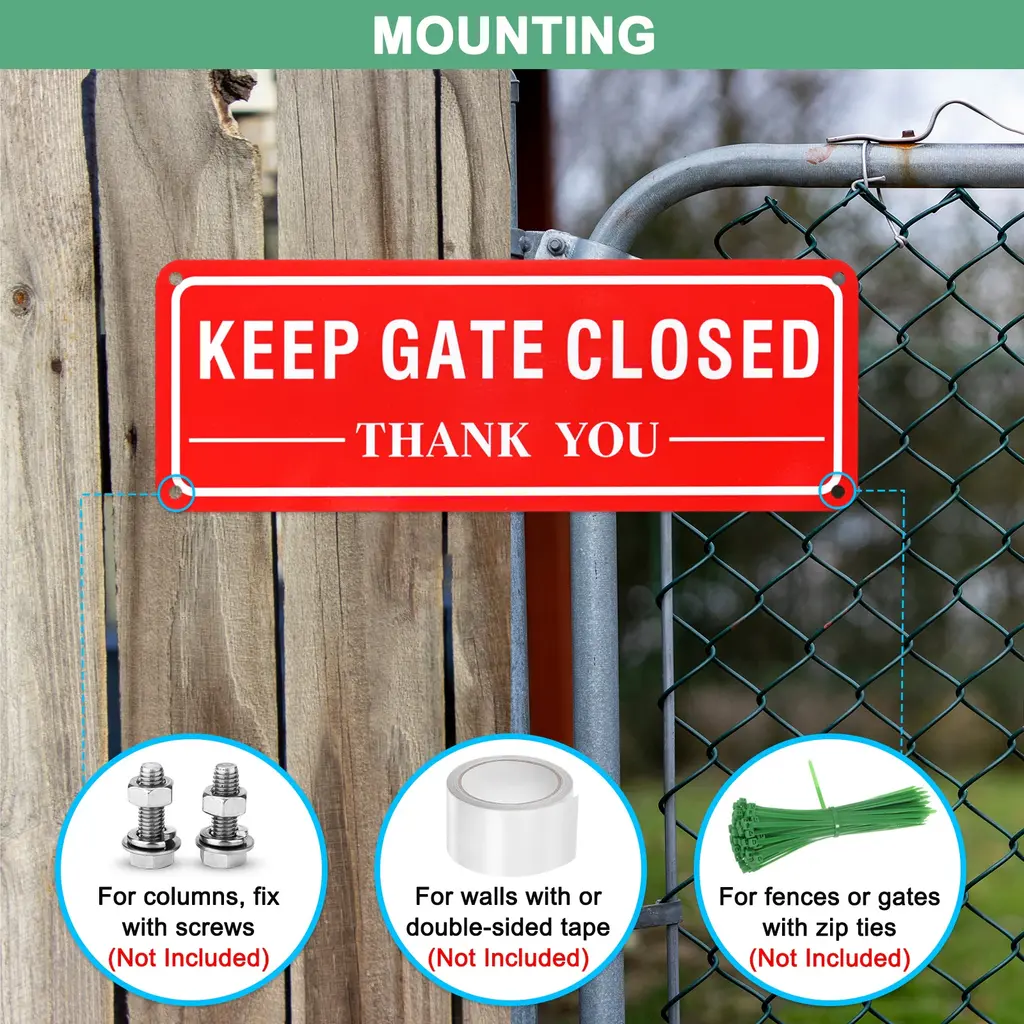 PRODUCT APPLICATIONSOur aluminum reflective signs are versatile. They can be placed in homes, offices, commercial buildings, and various places where they are needed. Its clear text can warn others easily.PRODUCT DETAILS & INCLUDE√ Material: Aluminum√ Color: White on Red√ Overall Size: 250mm x 90 mm / 10" x 3.5"(L x W)√ Package Includes: 2Pcs x Keep Gate Closed Thank you SignPRODUCT ADVANTAGES1. Our rust-free signs are made of high-strength rust-free aluminum with excellent durability, waterproof and anti-corrosion properties, not easy to bend and deform, and can be used indoors or outdoors for a long time without color fading or rusting.2. Our signboard is manufactured using a high-tech printing process with vibrant colors and eye-catching lettering, it is also reflective to remind others in the dark. It is a great choice for daily warning signsINSTALLATIONThis sign has pre-drilled holes so you can use zip ties, screws, double-sided tape, nuts, and bolts (installation accessories are not included), it can be mounted wherever you need it.