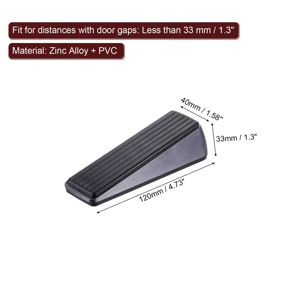 Description :Anti-Slip Design - The door stopper has a double-sided anti-slip function, with a horizontal stripe design on the surface, which increases the friction with the door and can easily fix the position of the door. The bottom hollowed-out anti-slip design keeps the door stable on the floor, with even force distribution during use, and is not easy to move.Material - The door stoppers for the bottom of the door are made of Zinc Alloy + PVC, soft and non-slip, they will not scratch the surface of the floor or door; It has elasticity and can adapt to larger gaps, and can also be used on floors of various materials (wooden boards, ceramic tiles, and so on), and the trapezoidal design also provides cushioning force when closing the door.Easy Using - Place the door stopper on the floor at a suitable distance, which is easy to replace and does not affect cleaning. In addition to being used as a buffer and fixing when opening the door, it can also be used when closing the door to stop it from opening from the outside.Wide Applications - These door stops can be applied to various occasions, such as offices, homes, shops, hotels, etc; These door stops ensure that doors do not accidentally slip and close, so you don't have to worry about the door suddenly closing in winds, protecting the door and walls.Specifications:Material: Zinc Alloy + PVCColor: Silver Total Size: 120 mm x 40 mm x 33 mm / 4.73 Inch x 1.58 Inch x 1.3 Inch (L*W*H)Fit for distances with door gaps: Less than 33 mm / 1.3 InchPackage Content: 2 Pcs x Door Stoppers