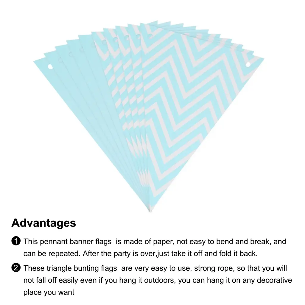 What is this?This pennant banner is mainly used for party decoration, you can hang or stick these decorative ribbons on the wall, window, door or shelf to add a different atmosphere to your party, mainly used for birthdays, weddings, Christmas, Easter, masquerade, graduation party and other partiesWhat will I get?Material: PaperColor:BlueFlag Quantity:12Hanging Length: 5m/16.4 FeetTriangle size:13*18cm / 5.12 x 7.09 inch(W*L)Package content:2 Pcs x Triangle HangingIs there any advantage of the product?1. This pennant banner flag is made of paper, not easy to bend and break, and can be repeated. After the party is over,just take it off and fold it back.2. Pennant banner flags string has solid color, you can DIY draw any pattern you want on the banner, adding a variety of decorations to your party.3. These triangle bunting flags are very easy to use, strong rope, so that you will not fall off easily even if you hang it outdoors, you can hang it on any decorative place you wantHow to use it?Unfold the triangle bunting flags , and then tie the ropes at both ends to a fixed positionWhat should I notice?Tips: please confirm the length before you buy.