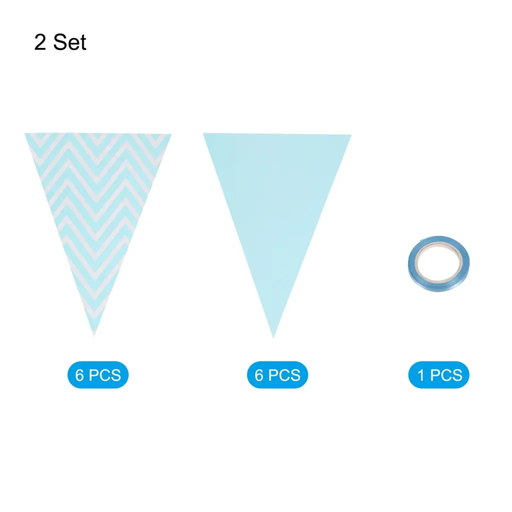 What is this?This pennant banner is mainly used for party decoration, you can hang or stick these decorative ribbons on the wall, window, door or shelf to add a different atmosphere to your party, mainly used for birthdays, weddings, Christmas, Easter, masquerade, graduation party and other partiesWhat will I get?Material: PaperColor:BlueFlag Quantity:12Hanging Length: 5m/16.4 FeetTriangle size:13*18cm / 5.12 x 7.09 inch(W*L)Package content:2 Pcs x Triangle HangingIs there any advantage of the product?1. This pennant banner flag is made of paper, not easy to bend and break, and can be repeated. After the party is over,just take it off and fold it back.2. Pennant banner flags string has solid color, you can DIY draw any pattern you want on the banner, adding a variety of decorations to your party.3. These triangle bunting flags are very easy to use, strong rope, so that you will not fall off easily even if you hang it outdoors, you can hang it on any decorative place you wantHow to use it?Unfold the triangle bunting flags , and then tie the ropes at both ends to a fixed positionWhat should I notice?Tips: please confirm the length before you buy.