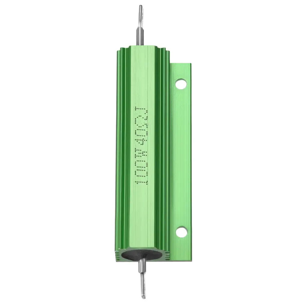 100 Wattage and 40 Ohm, 5% tolerance. Wire Wound Resistor owns high stability and accuracy. Moreover, it was used for various application because of the wide resistance range.Aluminum Housed. An insulated cover on the wounded wires would block out the heat, which promises the high performance of a resistor. Hence, the cooling job was achieved by aluminum case.This 100W resistor formed with qualified copper, nickel, and aluminum. With the compact structure and heat dissipation design, a capability of overload has been built.Board length 2.32 inches(59mm) and two rods with 2mm hole for a soldering connection. Dia. 3mm antisymmetric anchoring hole for holding, which will fit #2 Screws(or M2.3 nuts)Reliable. Problems like the flush LED would have a perfect solution, or you can use it in any AC DC circuits, converter, inverter, motor speed control, drivers, etc.100 Wattage and 40 Ohm, 5% tolerance. Wire Wound Resistor owns high stability and accuracy. Moreover, it was used for various application because of the wide resistance range.Aluminum Housed. An insulated cover on the wounded wires would block out the heat, which promises the high performance of a resistor. Hence, the cooling job was achieved by aluminum case.This 100W resistor formed with qualified copper, nickel, and aluminum. With the compact structure and heat dissipation design, a capability of overload has been built.Board length 2.32 inches(59mm) and two rods with 2mm hole for a soldering connection. Dia. 3mm antisymmetric anchoring hole for holding, which will fit #2 Screws(or M2.3 nuts)Reliable. Problems like the flush LED would have a perfect solution, or you can use it in any AC DC circuits, converter, inverter, motor speed control, drivers, etc.Specification:Main Body Length: 59 mm/ 2.32 inchesPower: 100 WattageRated Resistance: 40 RTolerances: 5%(J)Connection Type: Rod terminals with holeRod Length: 12mm/0.47 inchesScrew Hole: 3mm(Fit #2 or M2.3 nuts)Distance between screw hole: 45mmWeight: 58g/2.04 OzMaterials: Nickel alloys Wire Wound Resistor with Aluminum CaseColor: GreenPackage Content:2 x 100W 40R Aluminum Housed Resistor