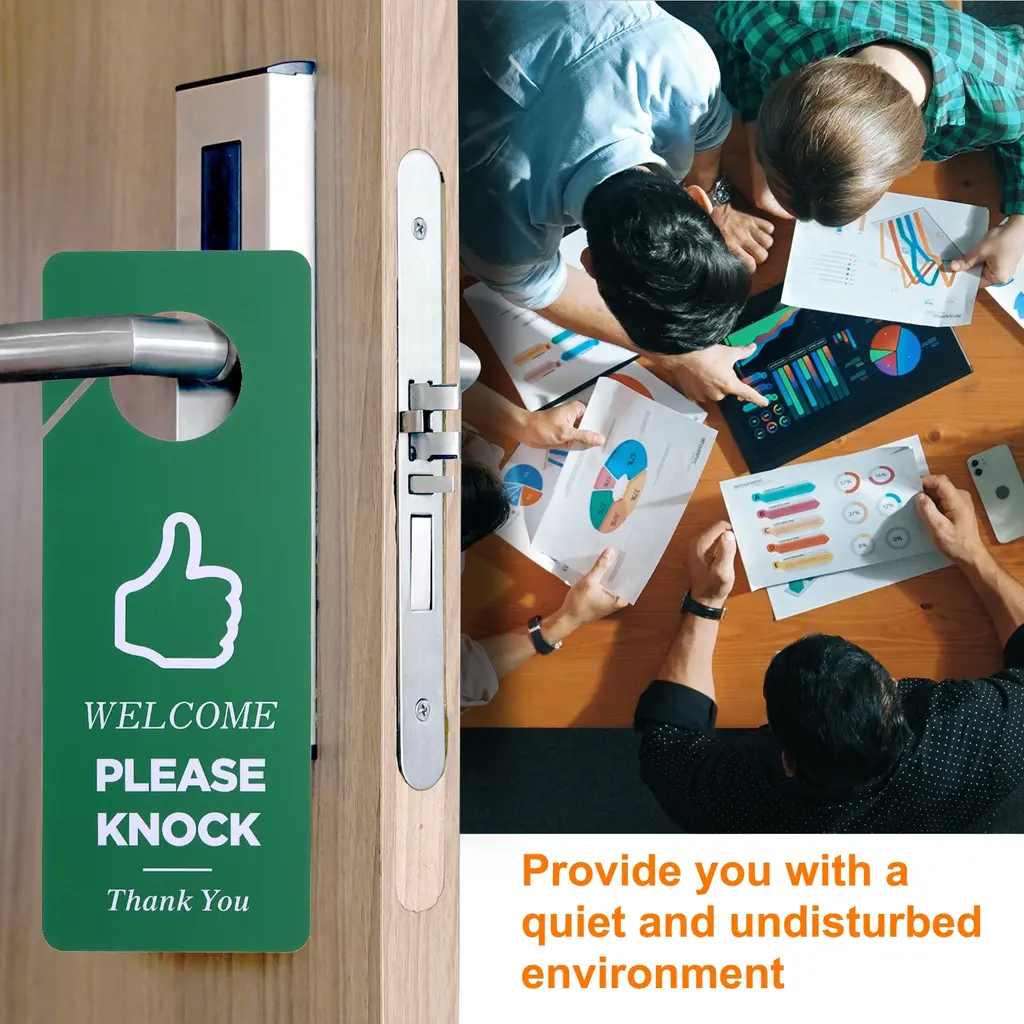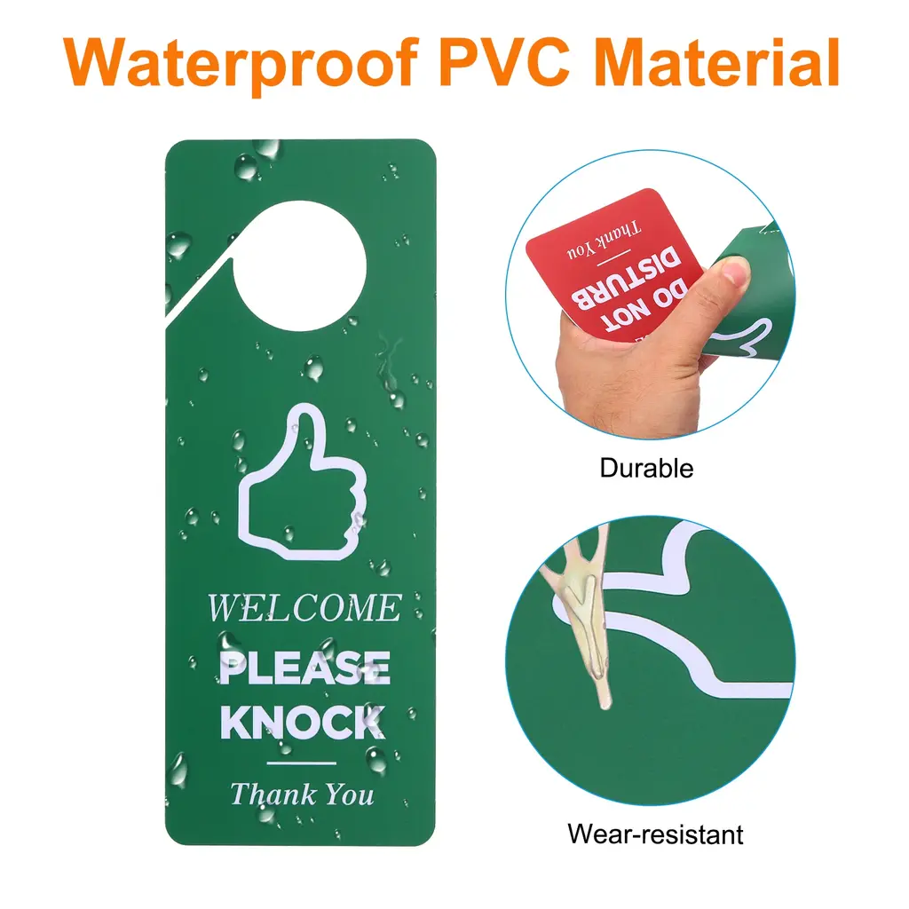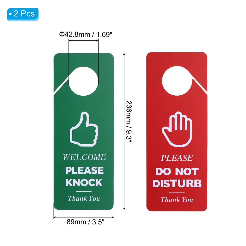 The Do Not Disturb and Please Knock Sign is widely used in homes, offices, businesses, retail stores, restaurants, and shops to prevent unnecessary interruptions and show that you need privacy or tell others you are free. It is also a great gift for your friends and families.SpecificationSize: 236 x 89 x 0.76 mm/ 9.3 x 3.5 x 0.03 Inch(L*W*T)Hole Diameter: 42.8 mm/1.69 InchColor: Red GreenMaterial: PVCPacking List: 2 Pcs x The Do Not Disturb and Please Knock SignAdvantage1. The do not disturb door hanger sign is made of PVC material which is durable, waterproof, wear-resistant, not easy to break, and can be used for a long time.2. Large hanger design suits various environments. Double-sided printing, large and eye-catching fonts, and elegant design can quickly attract people's attention. The simple design enables you to place it in any place.3. The double-sided design suits different situations, meeting your various needs. One side is printed with "WELCOME PLEASE KNOCK" and the other side is designed with"PLEASE DO NOT DISTURB".InstructionEasy to install. Directly hang the sign on doors, window, glass, walls, and anywhere you can hang.Note: Please check your size before purchasing.
