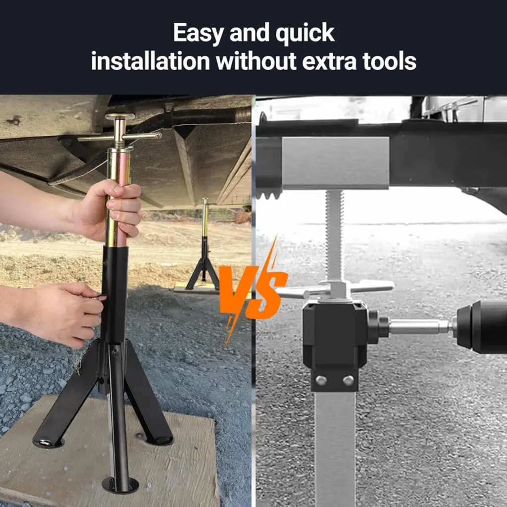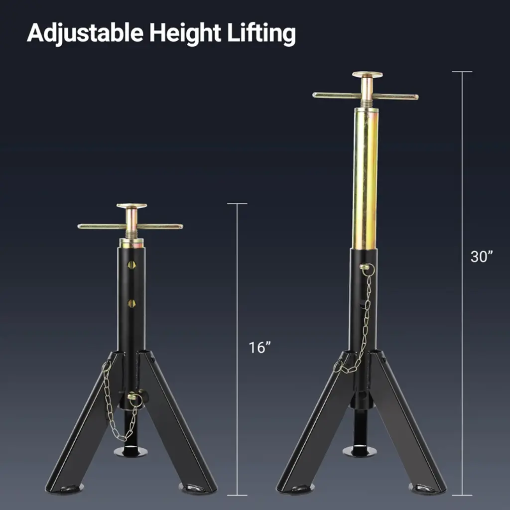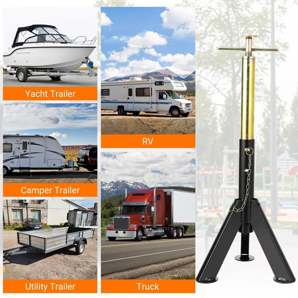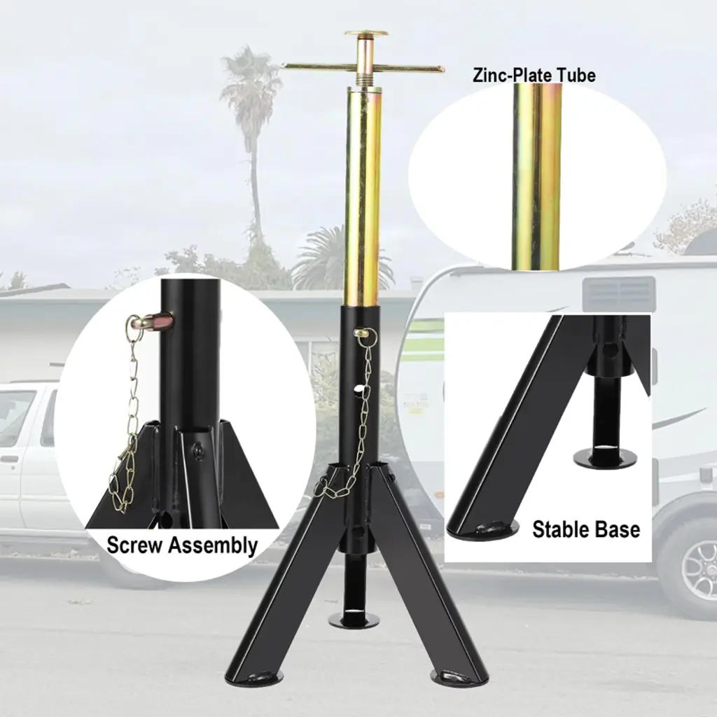 RV Stabilizer Jacks, 2 Pcs Telescopic RV Jacks 3Ton/6000Lbs Capacity ¨C Height Adjustable 16-30in, Heavy Duty Travel Trailer Stabilizer Jacks for RV Camper with Quick Pin & T-HandleProduct Description:Ensure unwavering stability for your RV or travel trailer with the TruAIR Telescopic Stabilizer Jacks! This 2-pack of heavy-duty jacks delivers a massive 6000 lb (3-ton) capacity per pair, with a height adjustment range of 16¨C30 inches to accommodate various vehicle levels. Constructed from high-quality alloy steel with anti-rust e-coating, these jacks feature a quick-pin for fast height setting, a zinc-plated telescopic tube, and a user-friendly T-handle for effortless stabilization. The wide circular base and triangular design enhance safety and load distribution, making them ideal for RVs, campers, boat trailers, and more.Key Features & Benefits:1. Massive 6000 LB Load CapacityWith a 3-ton (6000 lb) capacity per pair, these stabilizer jacks provide reliable support for RVs, travel trailers, and campers. The robust alloy steel construction ensures durability and safety during extended use.2. Telescopic Height Adjustment (16¨C30 Inches)Easily adjust the jack height from 16 to 30 inches using the quick-pin mechanism. Simply pull the pin, extend or retract the tube to the desired height, and re-engage the pin for secure positioning.3. Rust-Resistant & Durable BuildFinished with e-coating and zinc-plated components, the jacks resist rust, corrosion, and weathering. The wide circular base pad and triangular structural design enhance stability and weight distribution.4. Easy Operation with T-HandleThe integrated T-handle allows for quick manual lifting and stabilization. Position the jack under your RV and spin the handle to raise or lower it¡ªno tools required.5. Portability & Universal FitCompact and lightweight (16.87 lbs per jack), these jacks are easy to transport and store. Universally compatible with RVs, travel trailers, fifth wheels, boat trailers, and more.Specifications: Brand: TruAIR Color: Black Load Capacity: 6000 lbs (3 tons) per pair Height Range: 16¨C30 inches Material: Alloy Steel (e-coated and zinc-plated) Adjustment: Quick-Pin Locking Operation: T-Handle Manual Lift Base Design: Wide Circular Pad Item Weight: 16.87 lbs per jack Dimensions (Each): 17.72" L x 11.81" W x 11.02" H Compatibility: RVs, Travel Trailers, Campers, Boat Trailers Why Choose These Stabilizer Jacks? ? 6000 lb capacity for heavy-duty stabilization ? Quick-pin height adjustment (16¨C30 inches) ? Rust-resistant e-coating and zinc plating ? Easy T-handle operation ? Universal fit for RVs and trailers