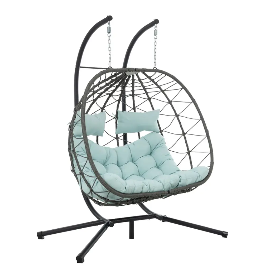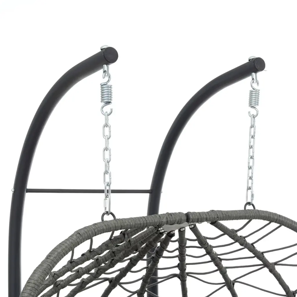 Unwind in style with this spacious Two-Person Hanging Egg Chair. Designed for both comfort and durability, it features a sturdy powder-coated metal frame wrapped in UV-resistant PE wicker. With a thick cushion and ergonomic shape, it offers the perfect spot for reading, relaxing, or enjoying a romantic moment. Its foldable design makes setup and relocation effortless—ideal for patios, gardens, balconies, or poolside lounging. Product Features Sturdy & Durable: Built with a powder-coated metal tube frame and handwoven PE wicker, this egg chair is made to withstand outdoor elements. UV-resistant materials ensure long-lasting use through hot summers and changing weather conditions.Comfortable & Spacious: Designed with ergonomic contours, soft cushioning, and a headrest for maximum comfort. The two-person seating design lets you share the moment with someone special.Functional & Convenient: Foldable structure makes it easy to move and set up wherever you need a cozy corner to rest or read—perfect for balconies, gardens, patios, or poolside settings.Easy Maintenance: The water-resistant cushion cover includes a zipper, allowing easy removal and cleaning to keep your egg chair looking fresh all season long. Product Description Product Name: Two-Person Hanging Egg Chair with StandMaterials: PE Wicker, Polyester Fiber, Powder-Coated Metal Tube, Plastic End CapsDimensions: 60.2" W x 36.2" D x 76.8" HWeight: 77.2 lbsWeight Capacity: Suitable for 2 adults (specify exact weight limit if available) Package Includes 1 x Two-Person Hanging Egg Chair with Stand1 x Thick Cushion with HeadrestAssembly Manual Maintenance & Notice Cushion Care: Remove cover and wash gently by hand or spot clean. Do not bleach or tumble dry.Storage Tips: When not in use, cover or store indoors to extend product lifespan.Color Disclaimer: Actual colors may vary slightly due to screen and lighting differences.
