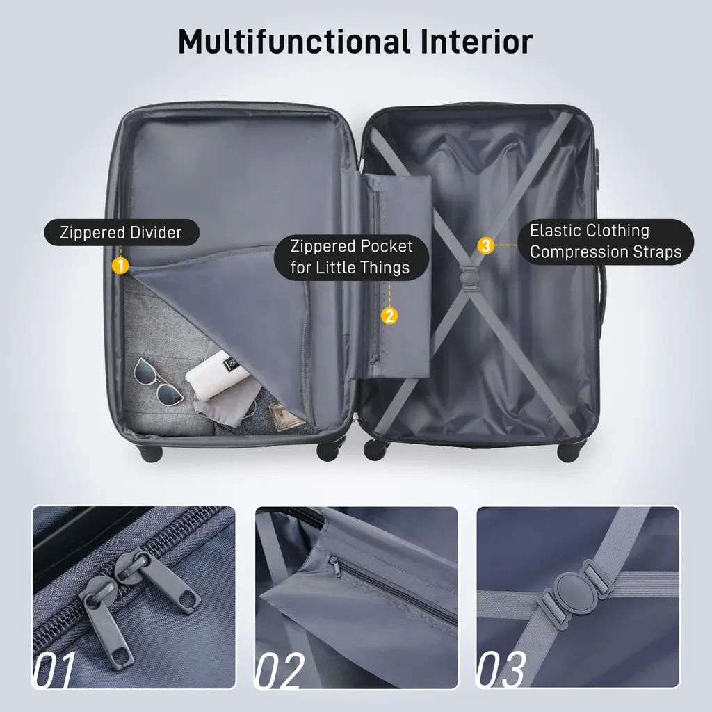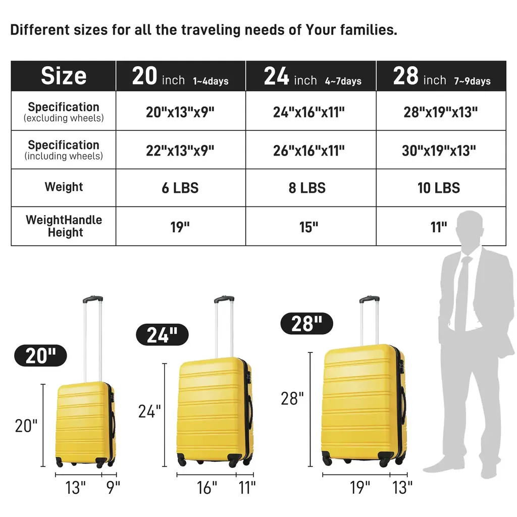 2-Piece Luggage: 2 sizes that you can choose from based on your personal or family needs to maximize your family, work, and travel needs.Material: Sturdy ABS shell is extremely crack-resistant, easy to clean, allowing you to enjoy the visual experience brought to you by the exquisite appearance of this luggage.Details: Ergonomic telescopic handle system allows you to organize your luggage more quickly and conveniently; TSA Customs combination lock design, better protection of the hard-side suitcase and .360 Degree Spinning Casters: Has 4 360-degree swivel wheels that rotate noiselessly and smoothly for easy mobility. All pieces roll upright to minimize arm strain.Ideal Interior Space: The interior of the luggage is equipped with straps for securing clothing, zippered divider pockets for wet/dry separations, and mesh compartments for documents or toiletries. Description:Product Name: Luggage SetMain Color: BlackMain Material: ABSProduct DimensionsAssembled Length (in.): 19.00Assembled Width (in.): 13.00Assembled Height (in.): 28.00Weight (lbs.): 16.00Package SizeLength (in.): 30.31Width (in.): 19.88Height (in.): 12.40Weight (lbs.): 17.99Packing list:Suitcase x 2