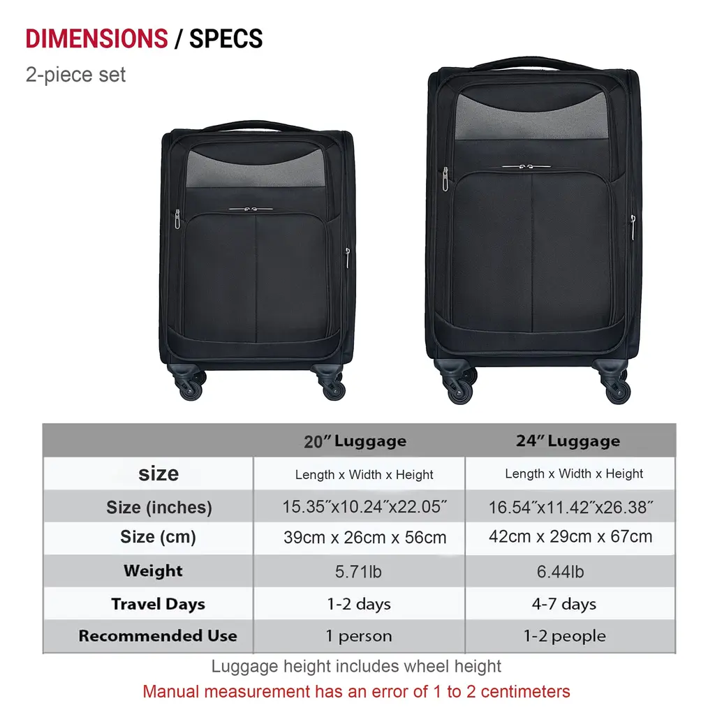 2 Piece Oxford Trolley Case Suitcase Set, Softshell Lightweight Durable Suitcase With Backpack And Universal Wheel, For Travel - Black
