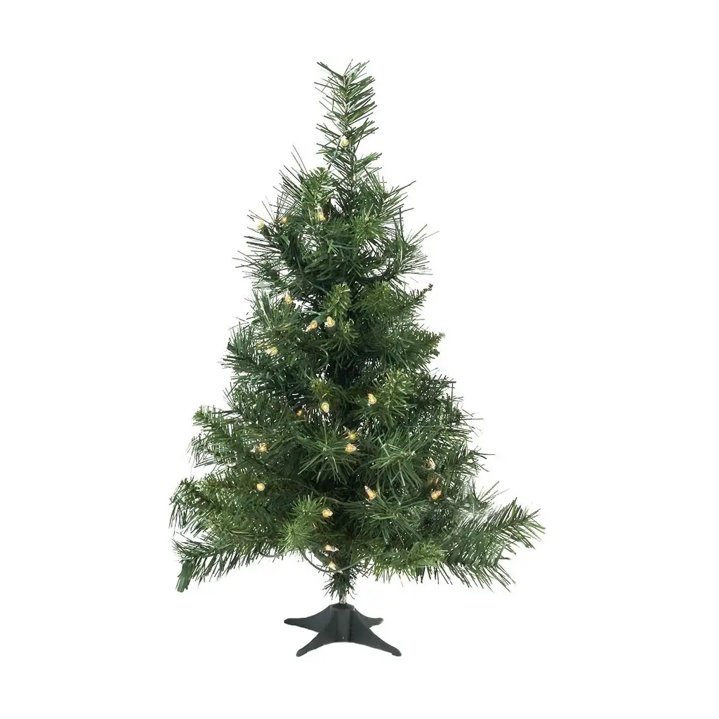 This gorgeous tree is sure to make your holiday season merry and bright. Its warm white lights are sure to light up not only the branches of this tree but also your holiday decor. Add mini ornaments and garland to create a unique decoration. Perfect for classrooms or offices. Product Features: Pre-lit with 35 clear lights. Bulb size: mini. 72 branch tips. 2-piece easy assembly (including stand). Medium profile tree. Additional Product Features: Light sets on tree are UL certified and approved for indoor or outdoor use however the tree itself is recommended for indoor use only. Comes with replacement bulbs and spare fuse. Contains 1 plug with end connector which allows you stack multiple lighted items together (not to exceed 210 watts). Comes with a free green plastic tree stand. Wire gauge: 22. Dimensions: 2' high (from the base of the stand to the top of the tree). 14" base diameter (at the widest point). Material(s): PVC/metal/glass bulbs/wire. Note: Branches are compressed for shipment and need to be fluffed out upon arrival to look like the photo.