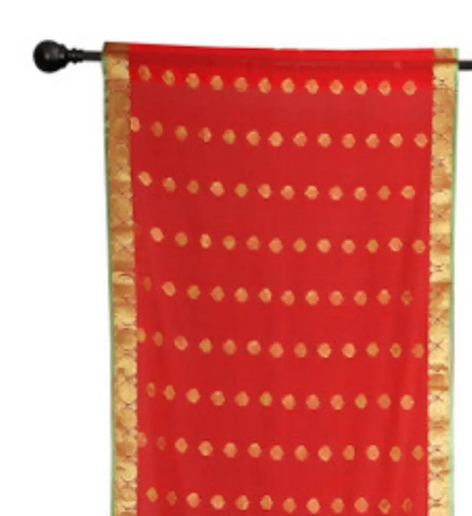 We offer this vibrant color gold zari motif Sari Curtains. They inject warm and rich color to your space and make a bold statement.If you've been looking for amazing window treatments, here you have found a vast selection of bright colors, dazzling and light material that will look great all year round. Sari Curtains / Drapes / Panels are the perfect choice for those looking for light, elegant drapes with a touch of luxury. It has smooth finish with a soft sheen and feels gentle and cool to the touch. Sheer curtains made of saris allow light in through windows but prevent people looking in when they are drawn. Story Behind the Art: The fabric of these curtains are weaved on a hand-loom in a small rural village in India and then hand-dyed. The artisans are a group of young hand-crafters who have moved from small villages to a big town in Central India and make various home decor items out of these exotic sari fabrics. This gives these wonderful artisans a way to have sustainable income via selling to the worldwide market on the internet. Your purchase supports local and home-based work where the artisans can easily tend to their families and pass these time-honored skills from one generation to the next.