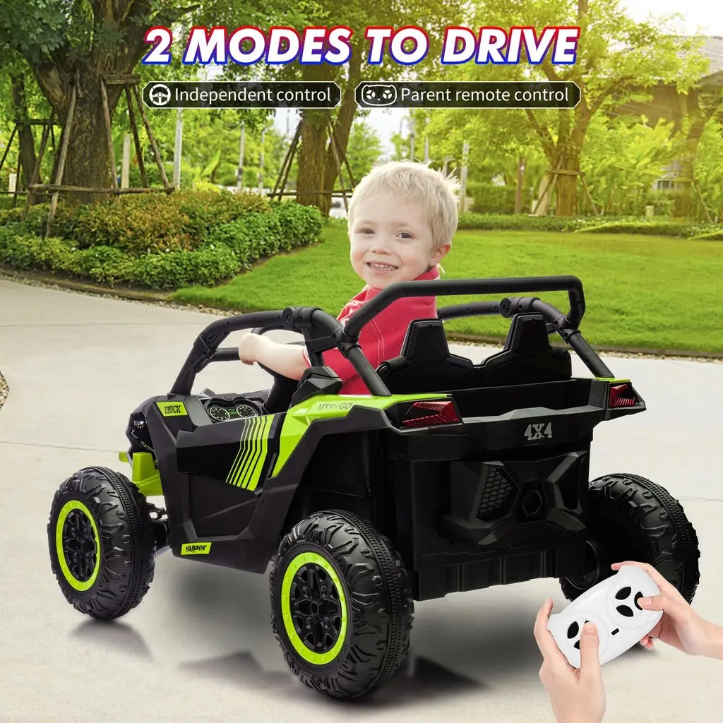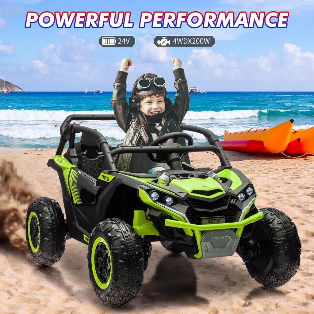Thrilling 4WD Off-Road Capability:This 24V electric UTV is designed with a robust 4WD system, allowing young adventurers to conquer various terrains with ease. Whether it's gravel paths, grassy yards, or dirt trails, this ride-on car provides a fantastic driving experience for thrill-seeking kids. User-Friendly Parental Remote Control:Equipped with a convenient remote control, parents can safely manage their child's driving experience. This feature allows for easy navigation of speed and direction, ensuring a fun and secure adventure while kids build their confidence behind the wheel. Comfortable and Spacious 2-Seater Design:Designed for two, this UTV encourages shared adventures among friends and siblings. The spacious seating arrangement ensures comfort during rides, making it perfect for playdates and family outings. Exciting Features for Endless Fun:With vibrant LED lights and a built-in music system, this ride-on UTV adds an element of excitement to every adventure. Kids can enjoy their favorite tunes while driving, enhancing their overall experience and making every journey memorable. Durable and Safe Construction:Built with safety in mind, this electric UTV is made from sturdy materials to withstand active play. Its robust design includes safety belts for secure seating, ensuring that kids can enjoy their rides with confidence and peace of mind.