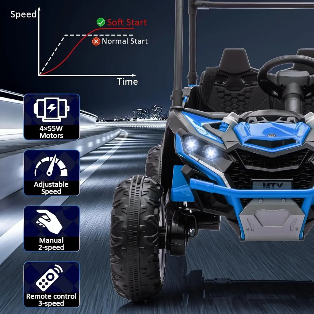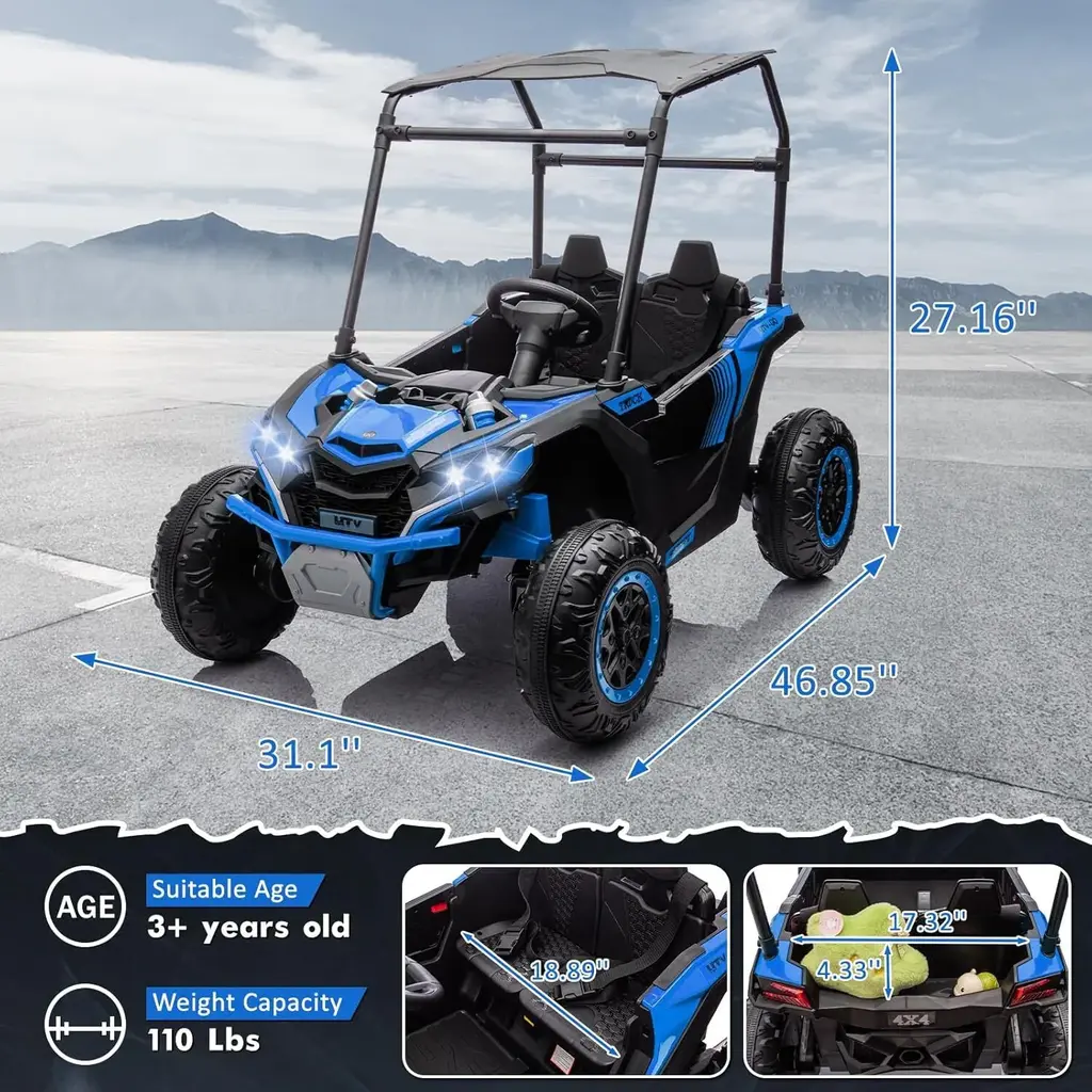 【Ideal Car Size for Kids】: Our 4-wheel drive all-terrain vehicle is made of a new PP and iron blend, suitable for kids aged 3 and up, with a maximum weight capacity of 110 pounds. After an 8-12 hour charge, it runs for 1-2 hours, and the soft start feature ensures safe riding for children.【Excellent Performance】: This ATV features a powerful 24V 7AH motor and four 200W engines. Kids can operate it independently using the electric foot pedal and buttons for forward and backward movement. It offers two-speed options: manual (2-speed) and remote control (3-speed) for a complete driving experience.【Big Pattern Wheels】: Conquer grass, dirt, driveways and sidewalks with four-wheel suspension, and pass the fun of powerful cars on to your kids so they can have a mini version of your favorite car.【Multifunctional Fun】: This ride-on all-terrain vehicle features built-in music and speakers, Bluetooth, a radio, a USB port, LED headlights, and high/low-speed functions, delivering a realistic off-road UTV truck driving experience.【Easy To Assemble and Use】: It features a one-touch soft start, steering wheel, and gas pedal, making it simple for your little adventurer to drive and enjoy the ride. The two-seater design is perfect for sharing fun, making it an ideal gift for kids. NOTE: Always keep your child in sight while they are in the car.