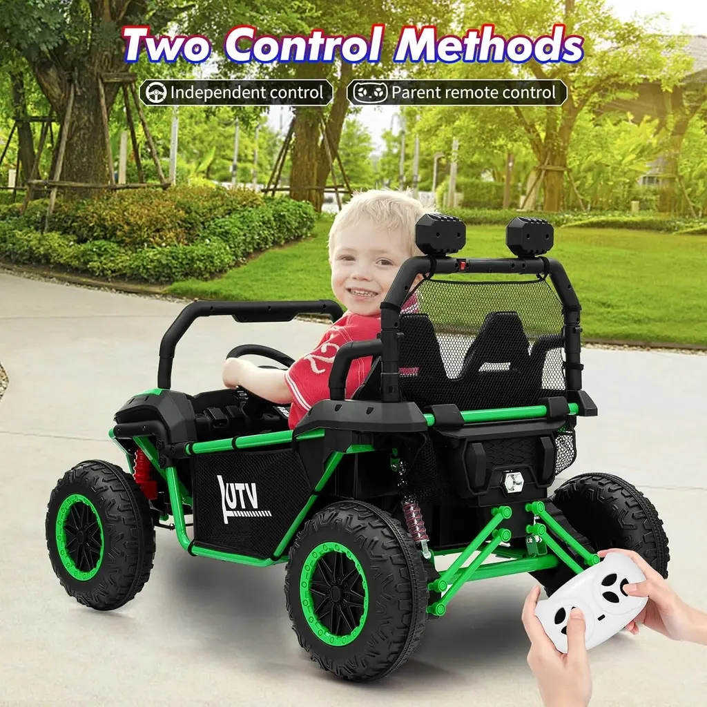24V 2WD Electric UTV: This ride-on car is equipped with a 24-volt fully charged battery, which can support 1-2 hours of operation. The 2X200W super motor can provide the car with stronger and more stable power, ensuring the best performance, so that your children can feel the fun of driving! (The specific use time is determined according to the specific actual situation)Extra-Large Double Seat Design: This XXXL UTV has an extra-wide 20-inches seat, which can accommodate two children aged 3-5 and one older child aged 8, making it suitable for a wide age range.Four-Wheel Shock Absorber Design: This large electric vehicle has 4-wheel shock absorbers, suitable for a variety of terrains, and can run normally even on a slope of 15 degrees.Stable Metal Frame and Safety Performance: The body and bottom of the car are made of metal frame to increase the durability and service life of the product. The metal frame design helps the stability of the car; the double seat belt design protects the safety of children at all timesMultifunctional Entertainment Design: This ride-on car features a one-touch start button with speakers and music, making driving enjoyable and pleasurable. Details such as LED lights and searchlights, forward and reverse switches make it more practical and easy to use; the remote control enables parents to also participate in their children's games.