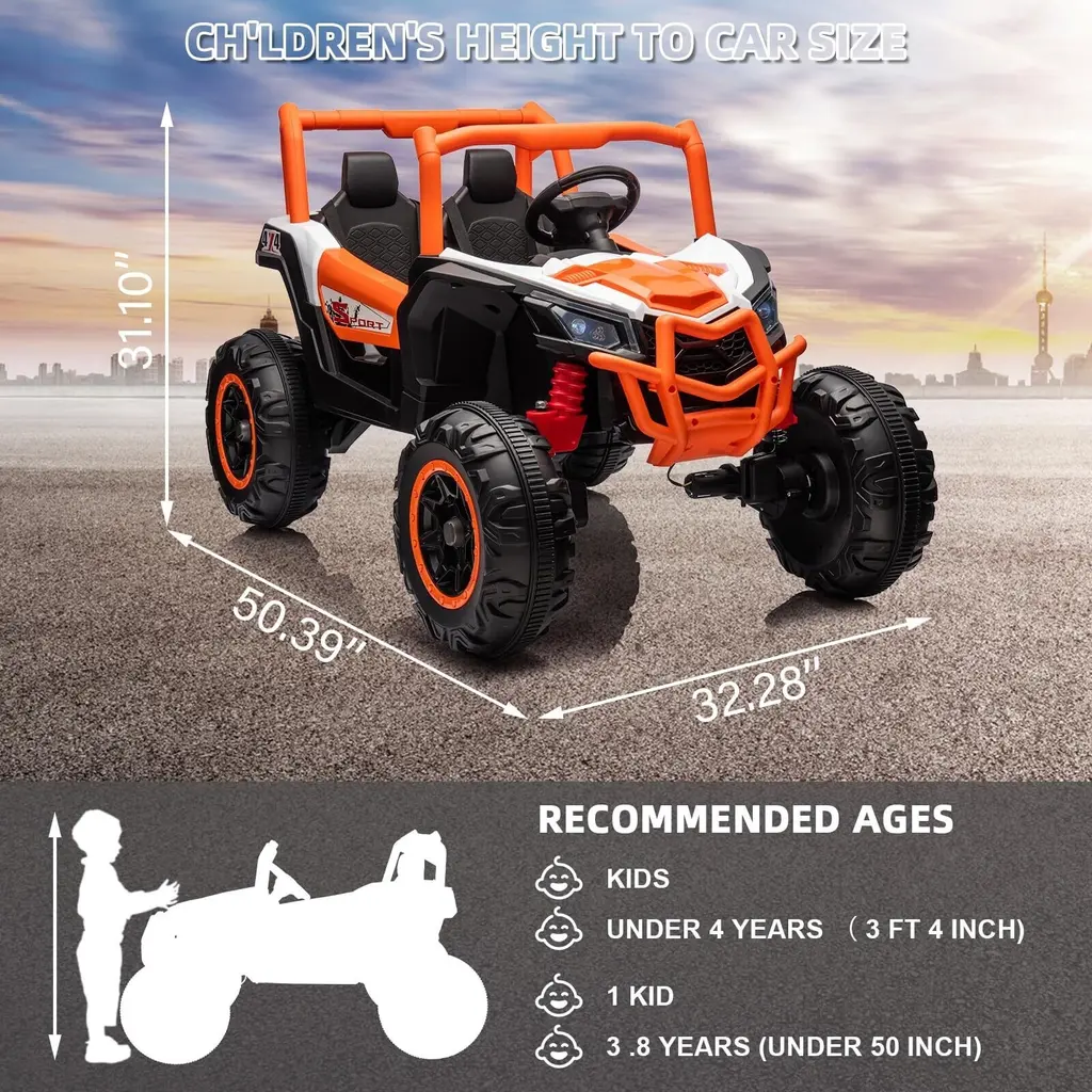 24V 2 Seater UTV - Hetoy Kids UTV is a true two-seater ride on car, with a seat width of 20" wide enough for two children to stretch their feet comfortably, and both seats are equipped with safety belts to ensure their safety. Remote Control & Manual Operate - This ride on car equipped with TWO driving mode, which allow your kids can operate this ride-on car by himself/herself by electric foot pedal and steering wheel(High/Low Speed). Or parents can use the 2.4ghz remote control to safely guide them when necessary. Cool Design & Music-Designed with 2 headlights and 2 colored tail lights, so children playing at night can be easily found.Choosing this UTV is equal to choosing happiness, in addition to the music that comes with the toy car, you can also connect Bluetooth to play any of your favorite sounds. Perfect Gift for Your Kids - This ride on car is suitable for 2 kids age for 3-8 years up. That is absolutely a good choice as a gift for your child on birthday and festival that accompany your children's growth, enrich their life and guard their driving dream. Safe & Comfortable Kids UTV - Made of non-toxic material and ASTM certified, ergonomic curved wide seat for comfortable sitting while footrests accommodate toddler's feet, all doubled the enjoyment during driving time.
