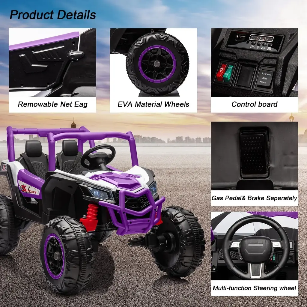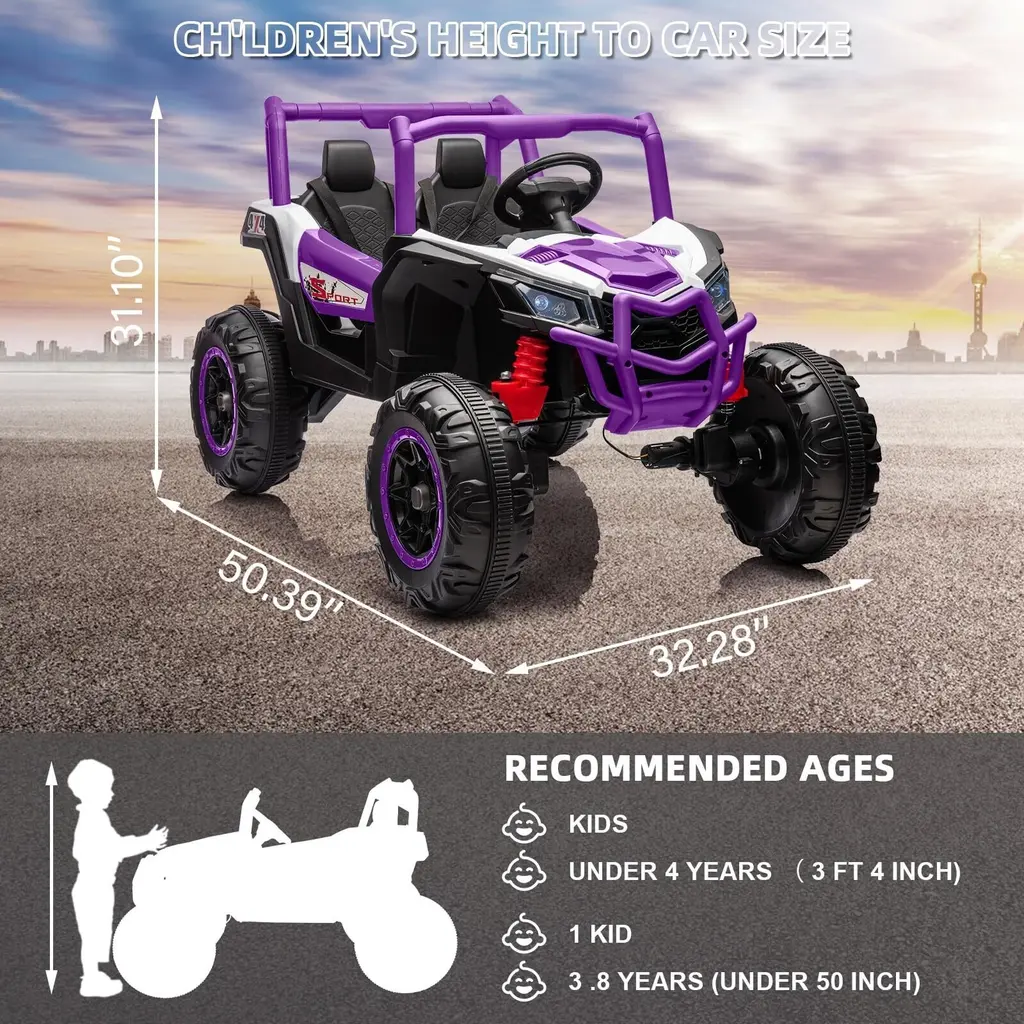 24V 2 Seater UTV - Hetoy Kids UTV is a true two-seater ride on car, with a seat width of 20" wide enough for two children to stretch their feet comfortably, and both seats are equipped with safety belts to ensure their safety. Remote Control & Manual Operate - This ride on car equipped with TWO driving mode, which allow your kids can operate this ride-on car by himself/herself by electric foot pedal and steering wheel(High/Low Speed). Or parents can use the 2.4ghz remote control to safely guide them when necessary. Cool Design & Music-Designed with 2 headlights and 2 colored tail lights, so children playing at night can be easily found.Choosing this UTV is equal to choosing happiness, in addition to the music that comes with the toy car, you can also connect Bluetooth to play any of your favorite sounds. Perfect Gift for Your Kids - This ride on car is suitable for 2 kids age for 3-8 years up. That is absolutely a good choice as a gift for your child on birthday and festival that accompany your children's growth, enrich their life and guard their driving dream. Safe & Comfortable Kids UTV - Made of non-toxic material and ASTM certified, ergonomic curved wide seat for comfortable sitting while footrests accommodate toddler's feet, all doubled the enjoyment during driving time.