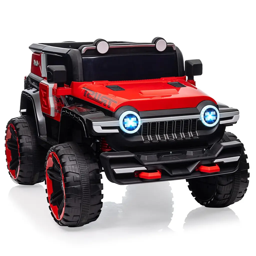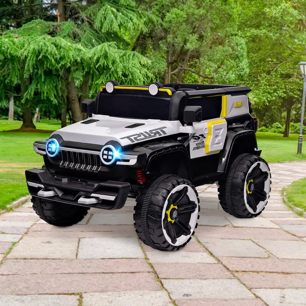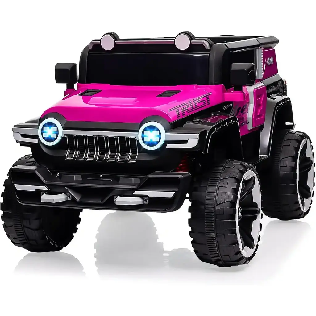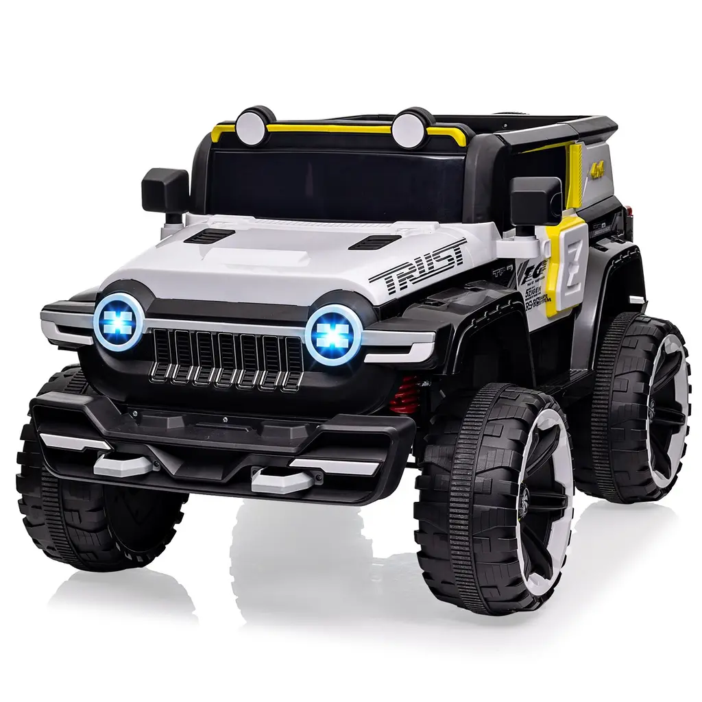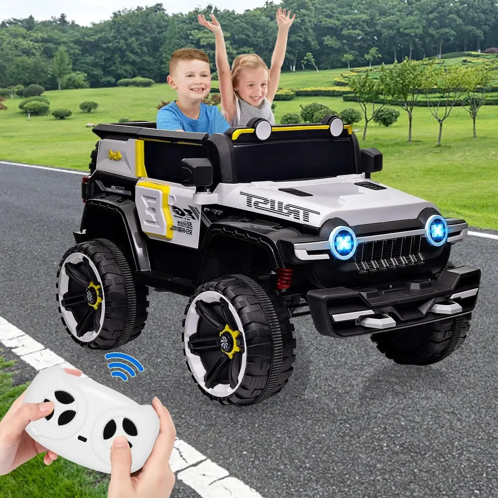 Dual Seater Fun: This 2 Seater Ride-On Car is designed to accommodate two children, making it an excellent choice for siblings or friends to enjoy together. Its spacious interior ensures that both passengers have plenty of room, promoting a fun and interactive experience for kids of all genders. 4WD Off-Road Adventure: Featuring a powerful 4WD system paired with 25W dual motors, this off-road truck is capable of handling a variety of terrains with ease. The spring suspension system contributes to a smooth ride, allowing little adventurers to explore the outdoors without limits or discomfort. Remote Control Safety: The included remote control allows parents to take charge and ensure the safety of younger drivers. This ride-on car offers two driving modes: kids can opt for self-driving, while parents can maintain control through the remote, providing both fun and peace of mind during playtime. Realistic Design: With its decorative spare tire and realistic truck design, this ride-on car enhances the driving experience with cool lighting and built-in music. Powered by a 12V electric battery, it delivers an immersive adventure that kids will thoroughly enjoy. Perfect Gift Choice: This 2 Seater Ride-On Car is the ideal gift for special occasions such as Christmas, birthdays, or other celebrations. Its combination of fun, adventure, and interactive play makes it a fantastic choice that is sure to bring joy and excitement to any child's day.