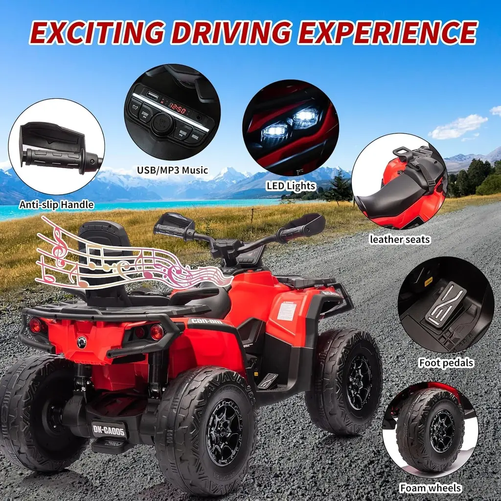 Powerful Performance with Four-Wheel Drive: This electric ATV features four robust 200W motors, achieving speeds between 1.86 mph and 4.97 mph. Powered by a 24V 7AH battery, it offers an exhilarating riding experience with up to 60 minutes of continuous fun, ensuring that your child can enjoy exciting adventures throughout the day. Spacious Two-Seater Design: Designed for shared fun, this ATV includes a long seat and safety belts that comfortably accommodate two riders. With a weight capacity of 110 lbs, it promotes active play and enables friends or siblings to join in on outdoor explorations, creating cherished memories together. Comfort and Realism in Every Ride: Unlike standard plastic seats, this ATV boasts luxurious leather seating designed specifically for two passengers, providing added comfort and support. Enhanced features such as functional headlights, a responsive steering wheel, and a sensitive throttle pedal contribute to a more authentic driving experience that kids will love. All-Terrain Capability for Endless Adventure: Equipped with durable, non-slip EVE tires, this 4WD ride-on vehicle can tackle a variety of surfaces, including concrete, gravel, dirt paths, wooden trails, and sandy areas. This ensures a smooth ride no matter where the adventure leads, encouraging endless outdoor fun. The Best Gift for Kids: With its sturdy construction and thoughtful safety features, this ride-on ATV is an ideal gift for children. Available in five vibrant colors, it makes for a fantastic surprise for Christmas, birthdays, or any memorable occasion, delighting your child or grandchild while providing a safe and enjoyable way to play.