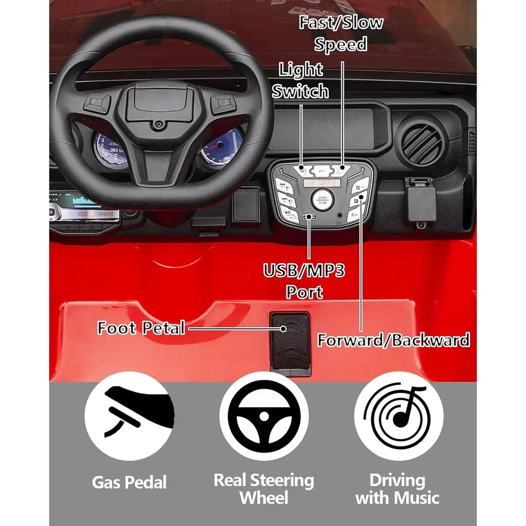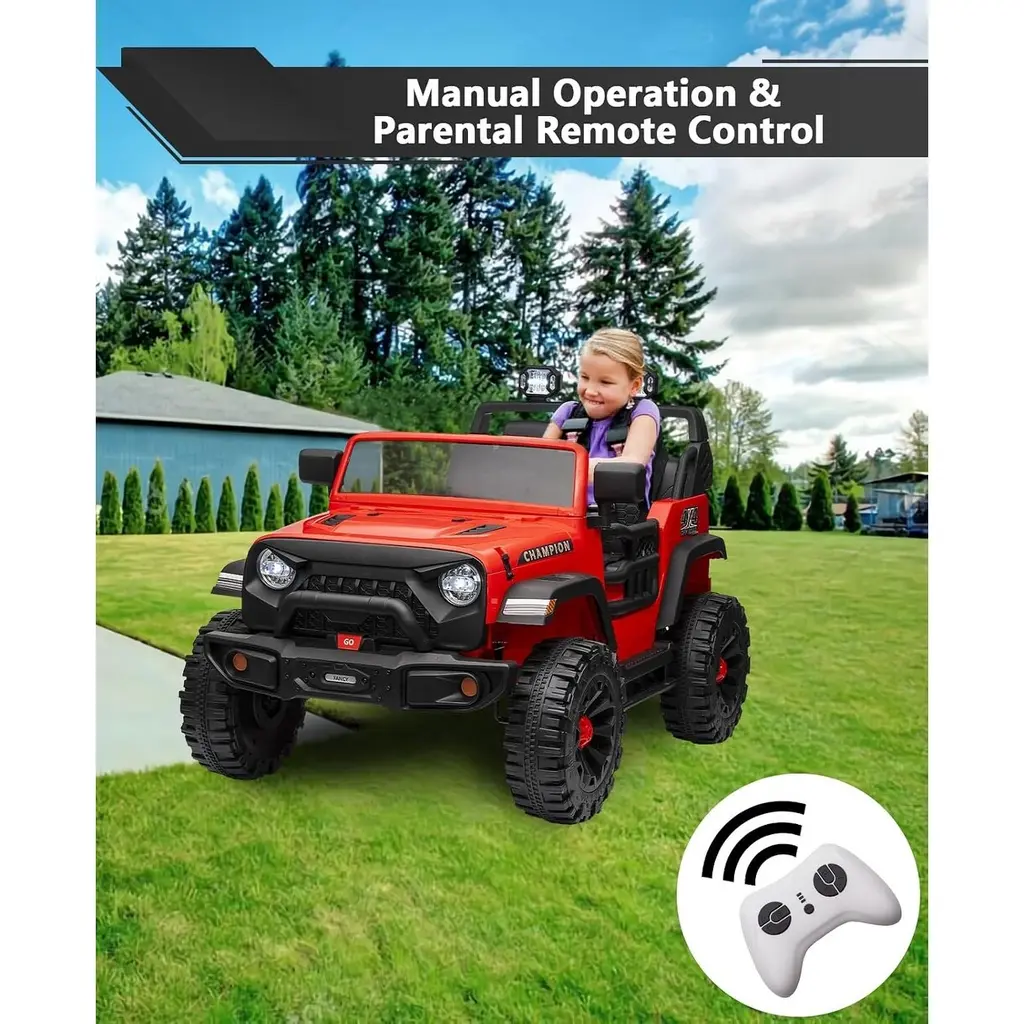 Spacious 2-Seater Design: This ride on truck is designed with roomy 20-inch dual seats, perfect for adventures with friends or siblings. Each seat has an independent 3-point safety harness, ensuring secure rides. Lockable doors add an extra layer of safety by preventing accidental openings while driving. Powerful Motors and 24V7AH Battery: This 24V ride-on car is equipped with dual 200W motors, providing strong and stable power for an exhilarating driving experience in any condition. With adjustable speed options ranging from 1.86 to 4.35 mph, your child can enjoy thrilling rides. Powered by 24V 7Ah battery, it ensures stable performance and extended playtime for endless fun. 2 Driving Modes for Extra Fun: Make playtime more exciting with two driving modes! Kids can take the 2 seater power wheels to develop their motor skills and hand-eye coordination, or parents can use a 2.4GHz remote to control the car’s direction and speed for added safety. This feature guarantees a fun ride while also strengthening the interaction between parent and child. Multi Entertainment Functions: This electric jeep is equipped with an MP3 player, AUX input, USB port, Bluetooth speaker, horn, headlights and high/low speed settings. Children can enjoy their favorite music while driving, making every adventure more enjoyable. A Best Gift for Children: Driving this kids' four-wheeler car, children can explore the outside world and satisfy their curiosity. They can also improve hand-eye coordination and sharing. This feature-rich item is a great choice as a birthday or Christmas gift for your kids.
