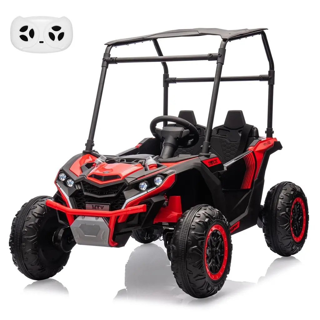 Ideal Car Size for Kids: This 4-wheel drive all-terrain vehicle is constructed from a durable blend of new PP and iron, making it suitable for children aged 3 years and up, with a maximum weight capacity of 110 pounds. After an 8-12 hour charge, the vehicle can run for 1-2 hours, and the soft start feature provides a safe and gentle introduction to riding for young children. Excellent Performance: Powered by a robust 24V 7AH motor and four 200W engines, this ATV allows kids to operate it independently using an electric foot pedal and buttons for forward and backward movement. It offers two-speed options: a manual 2-speed mode and a remote control 3-speed mode, ensuring a complete and customizable driving experience. Multifunctional Fun: This ride-on all-terrain vehicle is equipped with built-in music and speakers, Bluetooth connectivity, a radio, a USB port, and LED headlights. These features provide a realistic off-road UTV truck driving experience, enhancing the fun and entertainment for kids during their adventures. Big Pattern Wheels: Designed with four-wheel suspension and large patterned wheels, this ATV can easily navigate various terrains, including grass, dirt, driveways, and sidewalks. It allows children to experience the thrill of powerful cars, giving them a mini version of their favorite vehicles for adventurous outdoor play. Easy To Assemble and Use: With a one-touch soft start, a user-friendly steering wheel, and a gas pedal, this ATV is simple for little adventurers to operate and enjoy. The two-seater design encourages sharing fun with friends or siblings, making it an ideal gift for kids. NOTE: Always keep your child in sight while they are in the vehicle to ensure their safety.