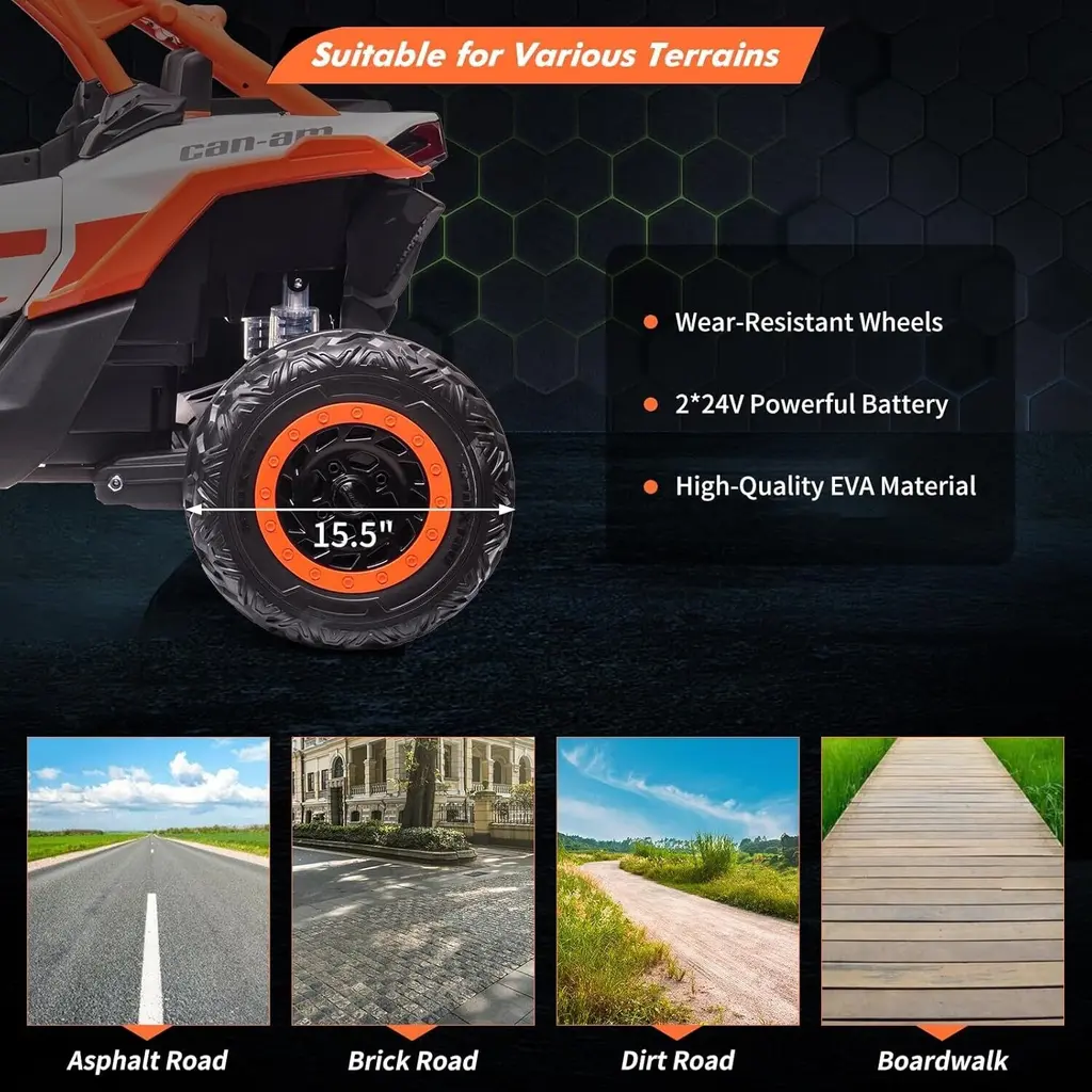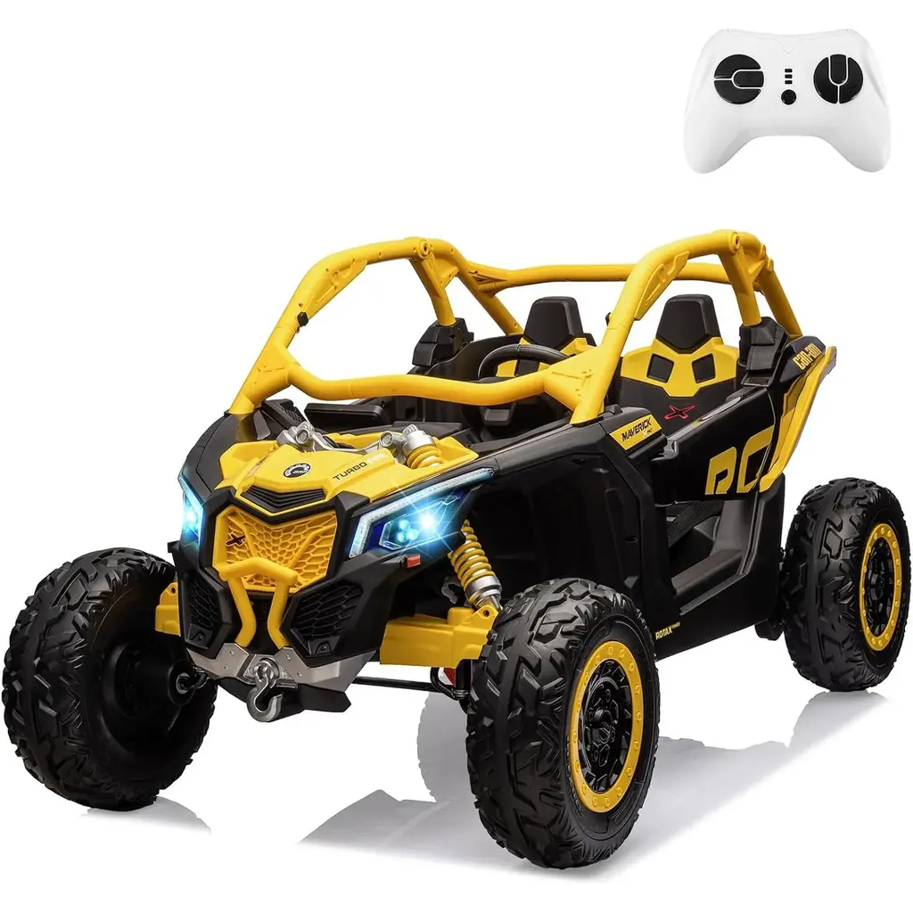 [Powerful Performance]: Equipped with 2* 24V 7AH rechargeable battery, 4 powerful 200W motors. Equipped with spring suspension, this UTV car ensures a smooth and comfortable ride even on rough terrains, providing a realistic driving experience for kids. [24V Licensed Can-Am Ride on UTV Car] : Ride-on UTV car is officially licensed by Can-Am and comes with a remote control.Children can drive the car themselves using the foot pedal for acceleration and the steering wheel for maneuvering. Alternatively, parents can take control using the 2.4G remote control, which provides forward, reverse, and park controls, steering operations, and 3-speed selection. [Different Speeds & LED Lights]: This electric car offers different speed options, allowing kids to select the appropriate speed based on their skill level. Additionally, it features cool LED lights that add to the car's realistic appeal. [Safe & Durable]: Made from durable materials that meet all child safety standards.Passed CPSIA, CPC and ASTM-F963 certification. The car has undergone rigorous testing for stability, asphyxiation, load, and shear, ensuring reliability and safety. [Gift for Kids] : With its realistic design, safety features, and exciting features, this ride on UTV car makes a perfect gift for kids. Qverall dimensions:57"*33.3"*31.3", with a maximum load of 130lb.The 23" larger seat provides added comfort for 2 children aged 3+ years.