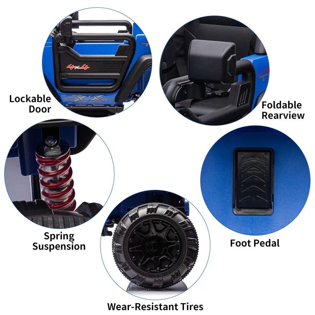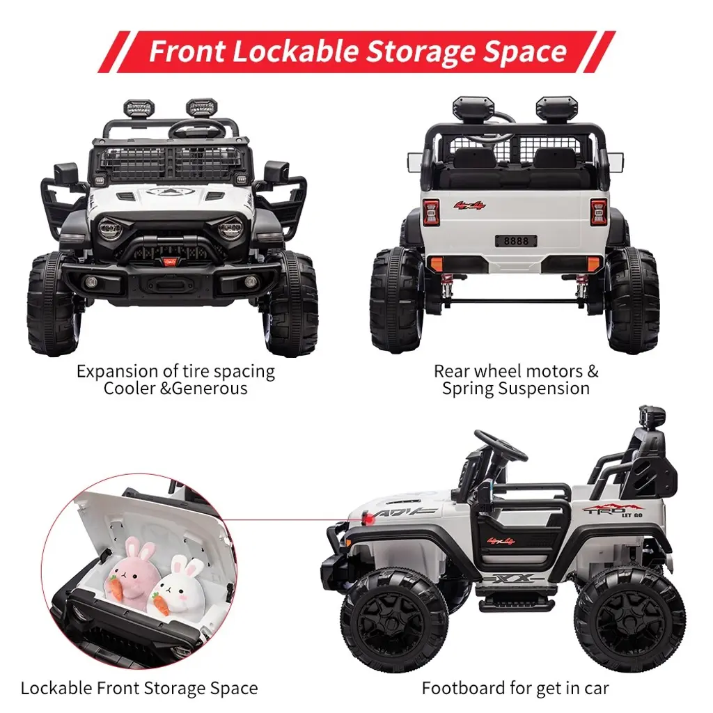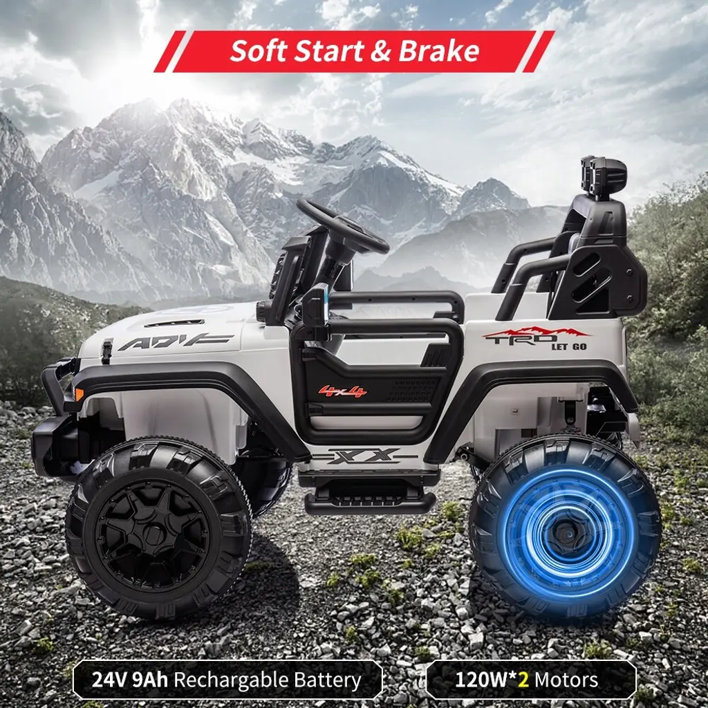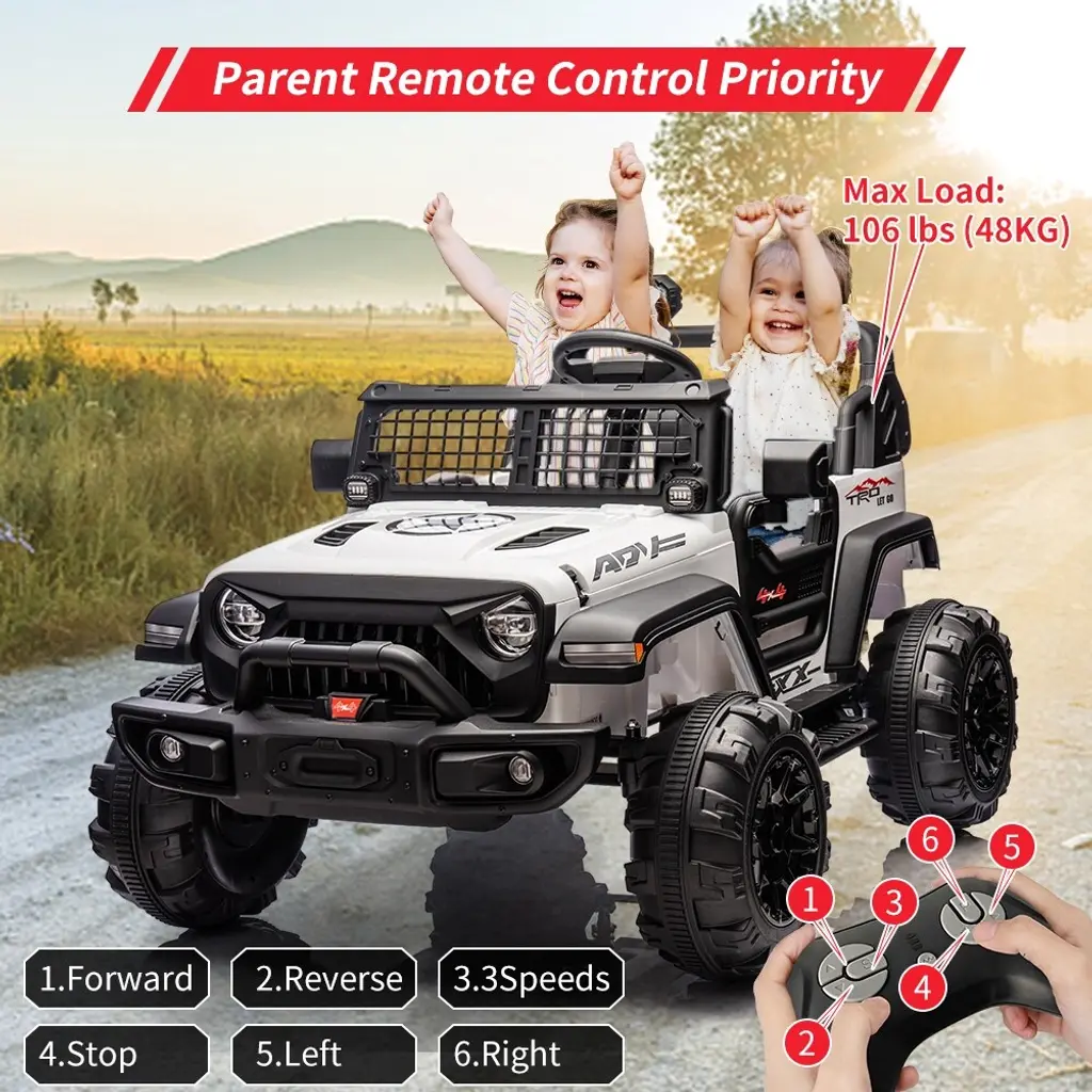 Extra Strong Motors: This ride-on car features a robust 24V 9AH battery coupled with two powerful 120W motors and 14.2" wheels, enabling it to tackle various terrains and provide continuous power for an exciting driving experience, regardless of conditions. Built-in Fun Features: The vehicle comes equipped with a range of entertaining features, including music, USB and FM connectivity, LED headlights, a horn, and a bottle holder. Additionally, a low power alarm function reminds kids to come back home in a timely manner, adding to its practicality. Spacious Two-Seater Design: Measuring 49.6" x 38.6" x 34.6" (L x W x H) with a seat width of 20", this ride-on car comfortably accommodates two children (under 4 years) or one child aged 4-8 years. It has a maximum load capacity of 48KG (106LB) and includes two individual safety belts for enhanced safety. Manual & Parental Control Options: Parents can enjoy quality time with their kids by controlling the car via remote control. Alternatively, children can operate the vehicle themselves using the foot pedal, allowing them to adjust their speed. Independent bearings on each wheel ensure smooth steering for a better driving experience. Best Gift for Kids: This ride-on car offers a realistic driving experience that helps develop children's hand-eye coordination skills while providing endless fun. It's a perfect gift that grows with children, making it an exceptional choice for birthdays, holidays, or special occasions.