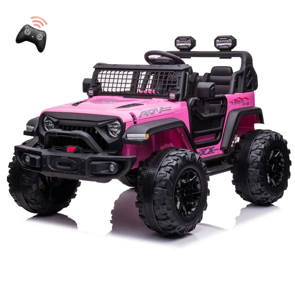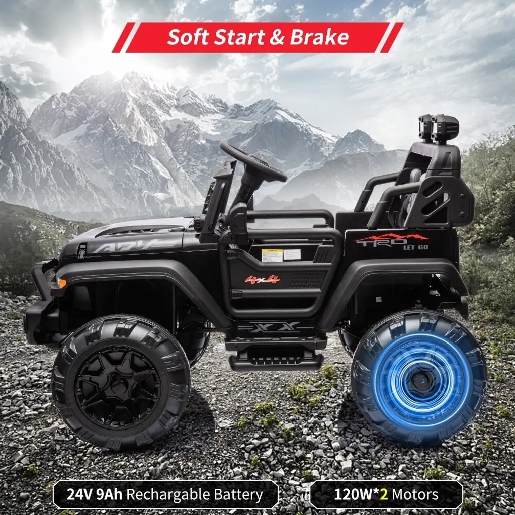 Powerful Motors: This ride-on car features a robust 24V 9AH battery paired with two 120W motors and 14.2" wheels, enabling it to tackle various terrains while providing consistent power in any environment. Built-in Entertainment: Designed for maximum fun, the ride-on vehicle includes music, USB connectivity, FM radio, LED headlights, a horn, and a bottle holder. Additionally, a low power alarm alerts kids when it's time to head home. Spacious Two-Seat Design: With overall dimensions of 49.6" x 38.6" x 34.6" (L x W x H) and a seat width of 20", this car comfortably accommodates two children under 4 years old or one child aged 4-8 years. It includes two individual safety belts for added protection, making it an ideal gift for young drivers. Manual and Parental Control Options: Parents can enjoy quality time by controlling the car via remote control, while kids also have the option to drive independently using a foot pedal to manage their speed. Each wheel is equipped with an independent bearing for smoother steering. Perfect Gift for Kids: This ride-on car offers a realistic driving experience that helps improve children's hand-eye coordination while providing endless fun. It's a fantastic gift that children can enjoy from childhood through their teenage years!