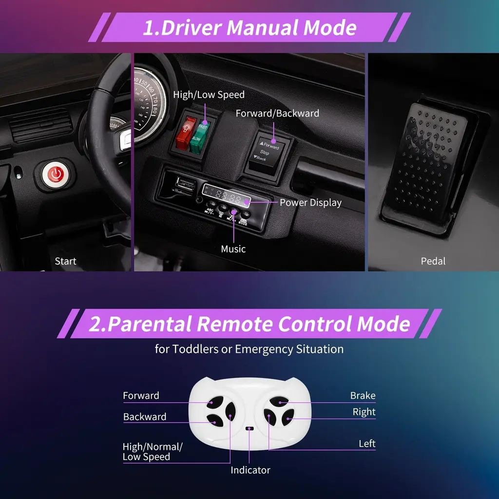 ☼4 Strong Motors: The ride on car equiped 24V 7AH battery and 4*45W powerful motors, can adapt to various terrain and provide continuous power in any condition!The slope of 20° can be easily passed. ☼Build-in Fun:The ride on vehicle already assembled with Music, USB, LED headlight+Tail Light to provide much more funny for children. The tail equipped with a shovel will bring more fun for kids.Play Time: 1.5-2.5 Hours after 8-12hours charging. ☼Real TWO Seats:Overall size: 47.6"*33"*32.3"(L x W x H). Seat Width: 19.7". Max Load:50KG(110LB). The car can easily load 2 kids(under 4 years) or one 4-8 years child to drive. 2 seats with 2 single safety belt. ☼Manual & Parental Control: The parent can control the car by remote control to enjoy the happiness time with child. The child also can operate by themself by foot pedal to control ideal speeds. Each wheel has an independent bearing to make steering smoother. ☼Delivered Two Packages: The ride on truck will be delivered in TWO packages! May can't be received in same day. After receiving both two boxes, then install it according to installation video or user manual.