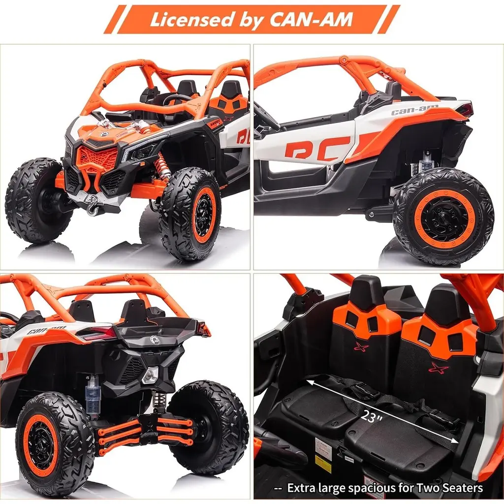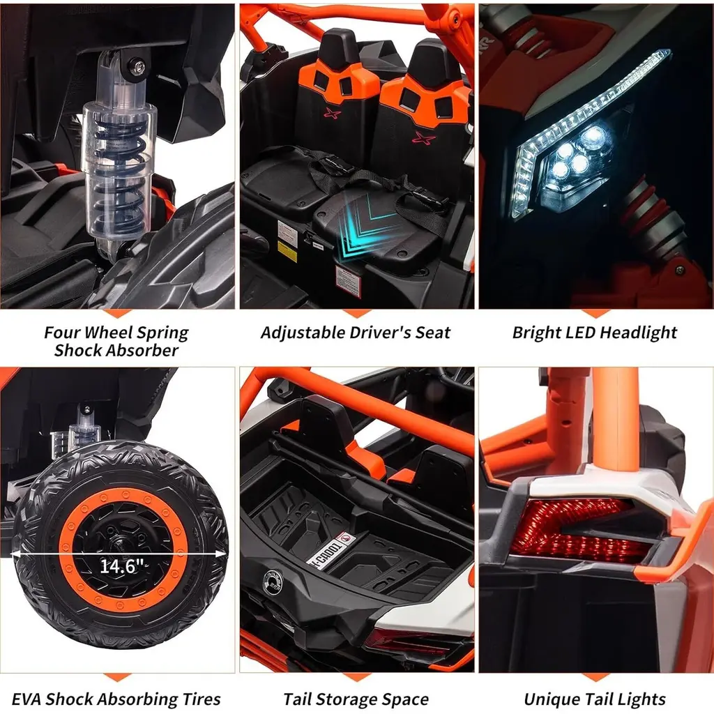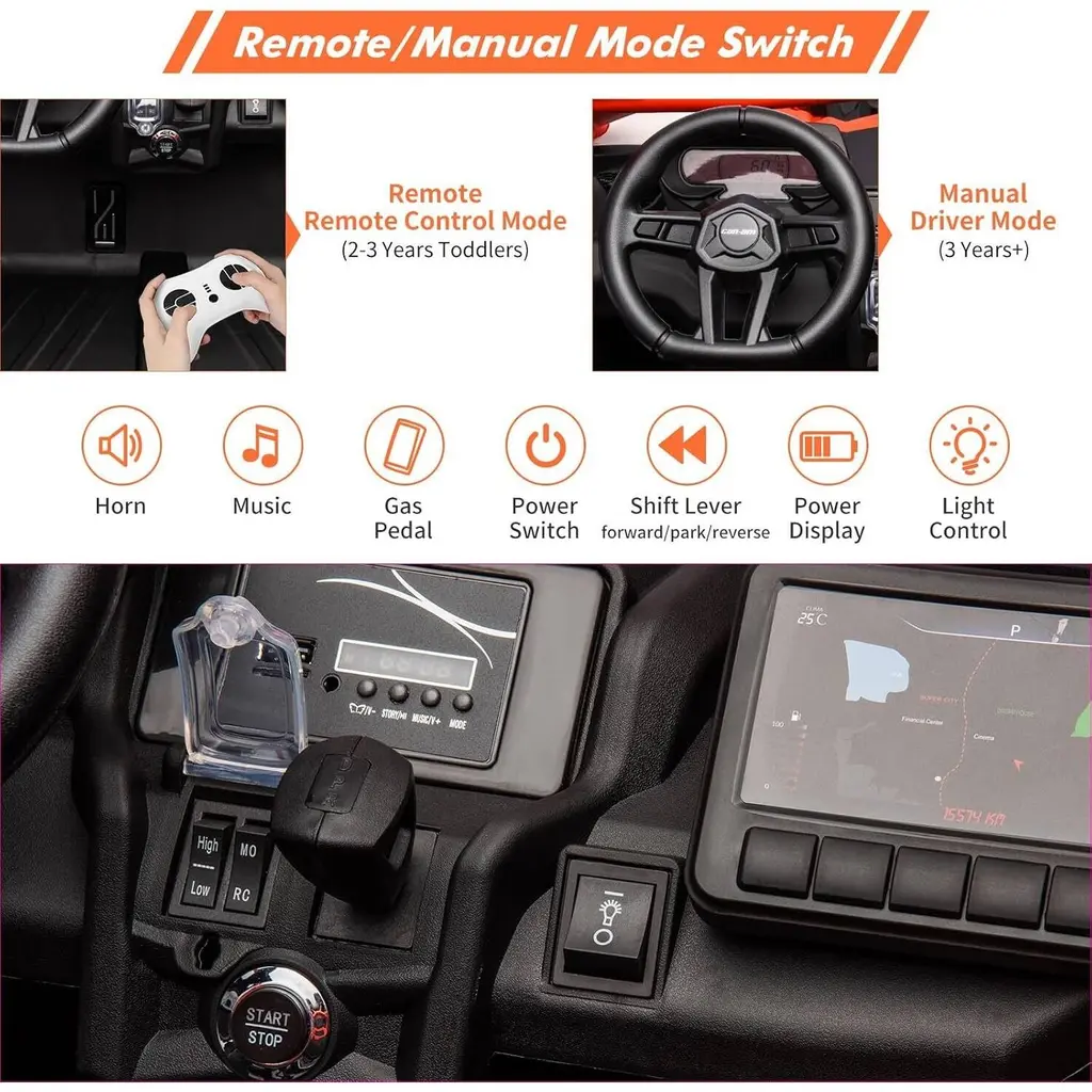 Powerful Performance: This ride-on UTV car is equipped with two 24V 7AH rechargeable batteries and four powerful 200W motors, ensuring robust performance. The addition of spring suspension provides a smooth and comfortable ride, even on rough terrains, delivering a realistic driving experience for young adventurers. 24V Ride-On UTV Car with Remote Control: This UTV allows children to drive independently using the foot pedal for acceleration and the steering wheel for maneuvering. Alternatively, parents can take control with the 2.4G remote control, which offers forward, reverse, and park functions, steering operations, and three-speed selection for enhanced safety. Different Speeds & LED Lights: The electric car features multiple speed options, enabling kids to choose the appropriate speed based on their skill level and comfort. Additionally, it is equipped with cool LED lights that enhance the vehicle's realistic appeal and add excitement to every ride. Safe & Durable Construction: Made from high-quality durable materials that meet all child safety standards, this ride-on car has passed CPSIA, CPC, and ASTM-F963 certifications. It has undergone rigorous testing for stability, asphyxiation, load, and shear, ensuring reliability and safety for young drivers. Perfect Gift for Kids: With its realistic design, numerous safety features, and exciting functionalities, this ride-on UTV car makes an ideal gift for children. With overall dimensions of 57" x 33.3" x 31.3" and a maximum load capacity of 130 lbs, it features a spacious 23" seat that provides added comfort for two children aged 3 years and older, ensuring hours of outdoor fun.