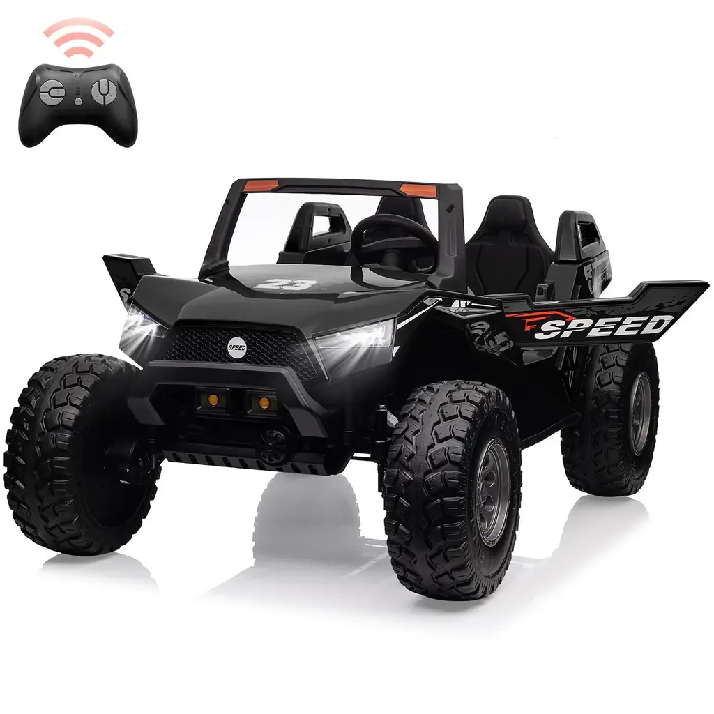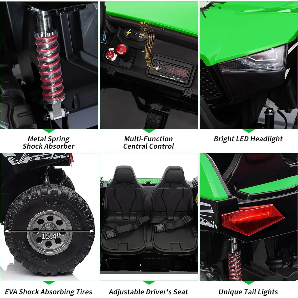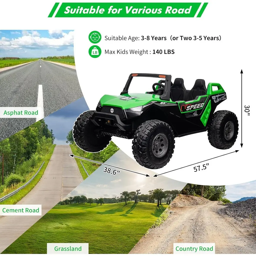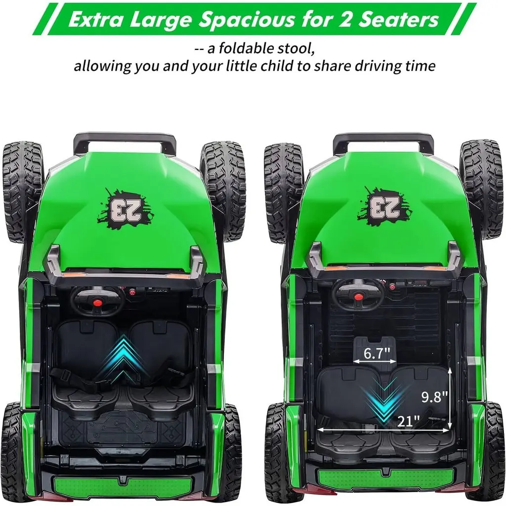 Remote Control and Manual Driving: This 2-seater electric car offers versatile driving options, allowing kids to drive independently using the foot pedal and steering wheel. Parents can also take control with a remote that includes an emergency brake function, ensuring an extra layer of safety during play. Multiple Fun Features: Equipped with a multifunctional music panel, the kids' car allows connection of audio devices via USB, TF card, or AUX port. This feature enables children to enjoy their favorite music while driving, enhancing the overall excitement of their ride. Specially Designed 2+1 Adjustable Seats: The car features adjustable seating for two children aged 3-5 years, with a seat length of 21 inches. An additional foldable small stool is included for older children, accommodating different ages and allowing for cooperative play or supervision while driving. Safety Guarantee: This ride-on UTV is certified by CPSIA and includes a slow start function, parent remote control, adjustable seats with belts, large EVA shock-absorbing tires, and metal spring suspension. These safety features work together to prevent falls and ensure a secure driving experience for children. Best Gift for Kids: Measuring 57.5" x 38.6" x 30", this spacious car supports a maximum load of 140 lbs and offers speeds ranging from 1.8 to 5 mph. Its powerful 24V 7Ah battery provides extended playtime, making it an ideal gift for birthdays, holidays, Christmas, or New Year celebrations. Note: Always supervise children during play and keep them away from hazardous areas such as roads and water.