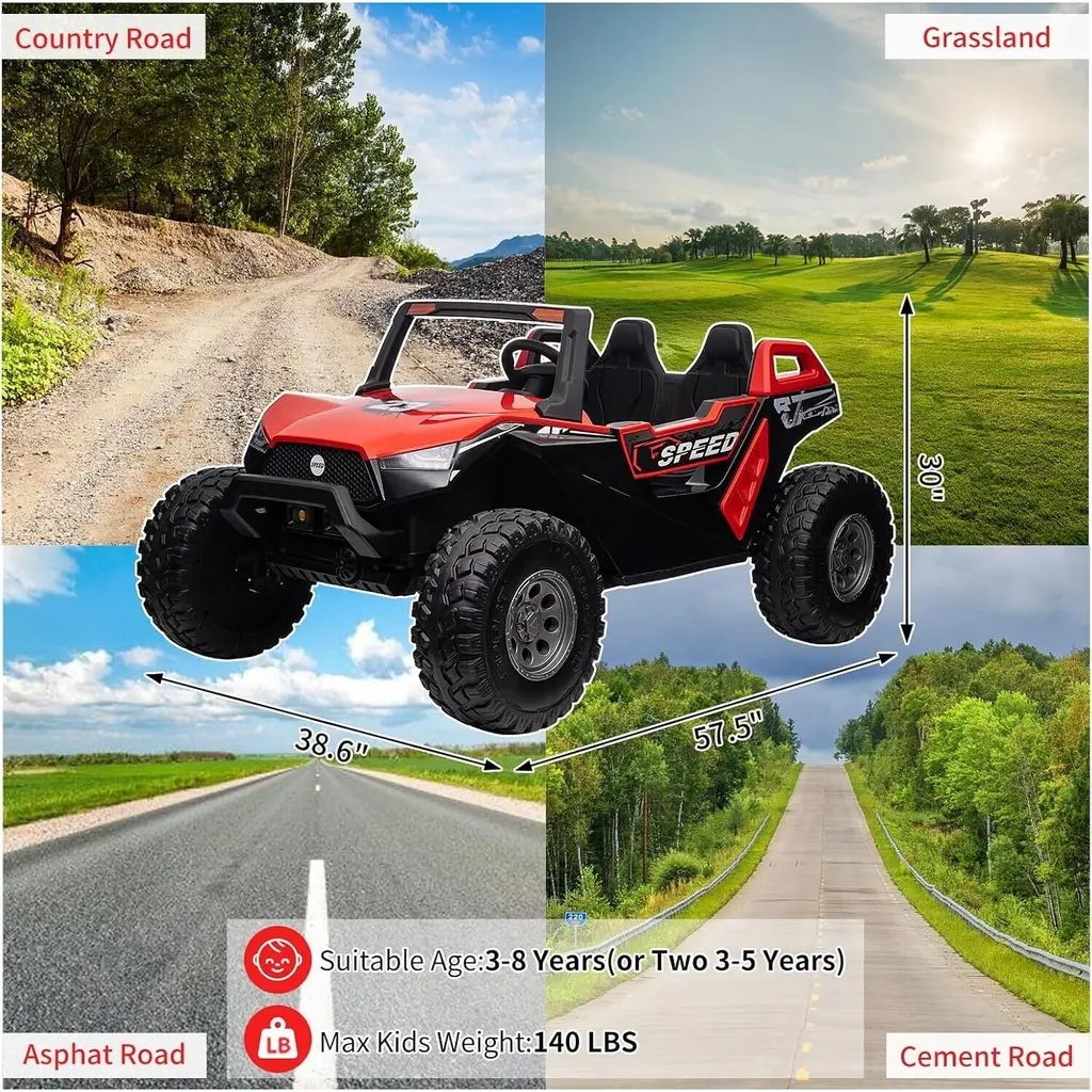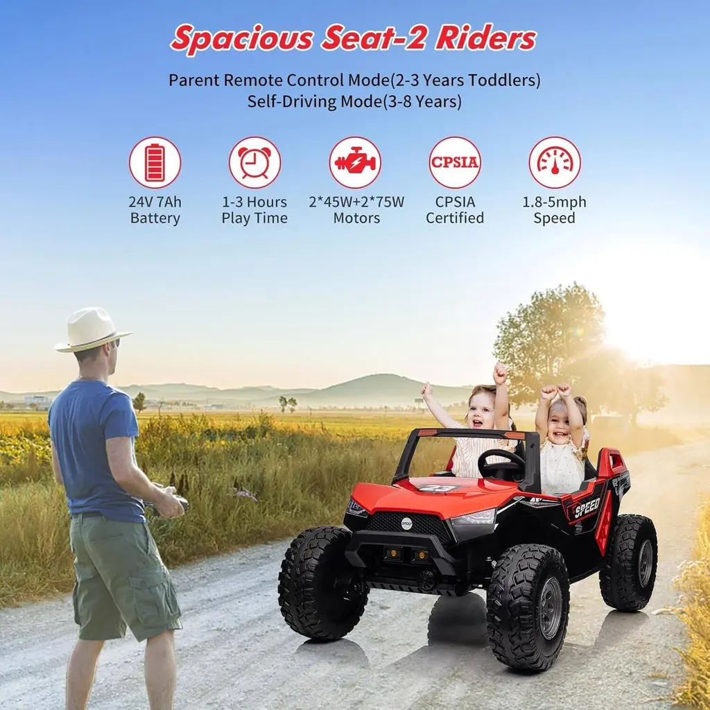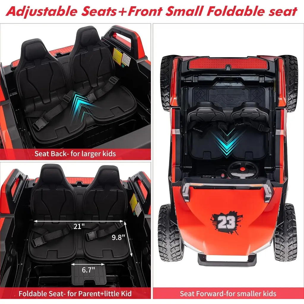 Remote Control and Manual Driving: This 2-seater electric car offers versatile driving options, allowing kids to drive independently using the foot pedal and steering wheel. Parents can also take control with a remote that includes an emergency brake function, ensuring an extra layer of safety during play. Multiple Fun Features: Equipped with a multifunctional music panel, the kids' car allows connection of audio devices via USB, TF card, or AUX port. This feature enables children to enjoy their favorite music while driving, enhancing the overall excitement of their ride. Specially Designed 2+1 Adjustable Seats: The car features adjustable seating for two children aged 3-5 years, with a seat length of 21 inches. An additional foldable small stool is included for older children, accommodating different ages and allowing for cooperative play or supervision while driving. Safety Guarantee: This ride-on UTV is certified by CPSIA and includes a slow start function, parent remote control, adjustable seats with belts, large EVA shock-absorbing tires, and metal spring suspension. These safety features work together to prevent falls and ensure a secure driving experience for children. Best Gift for Kids: Measuring 57.5" x 38.6" x 30", this spacious car supports a maximum load of 140 lbs and offers speeds ranging from 1.8 to 5 mph. Its powerful 24V 7Ah battery provides extended playtime, making it an ideal gift for birthdays, holidays, Christmas, or New Year celebrations. Note: Always supervise children during play and keep them away from hazardous areas such as roads and water.