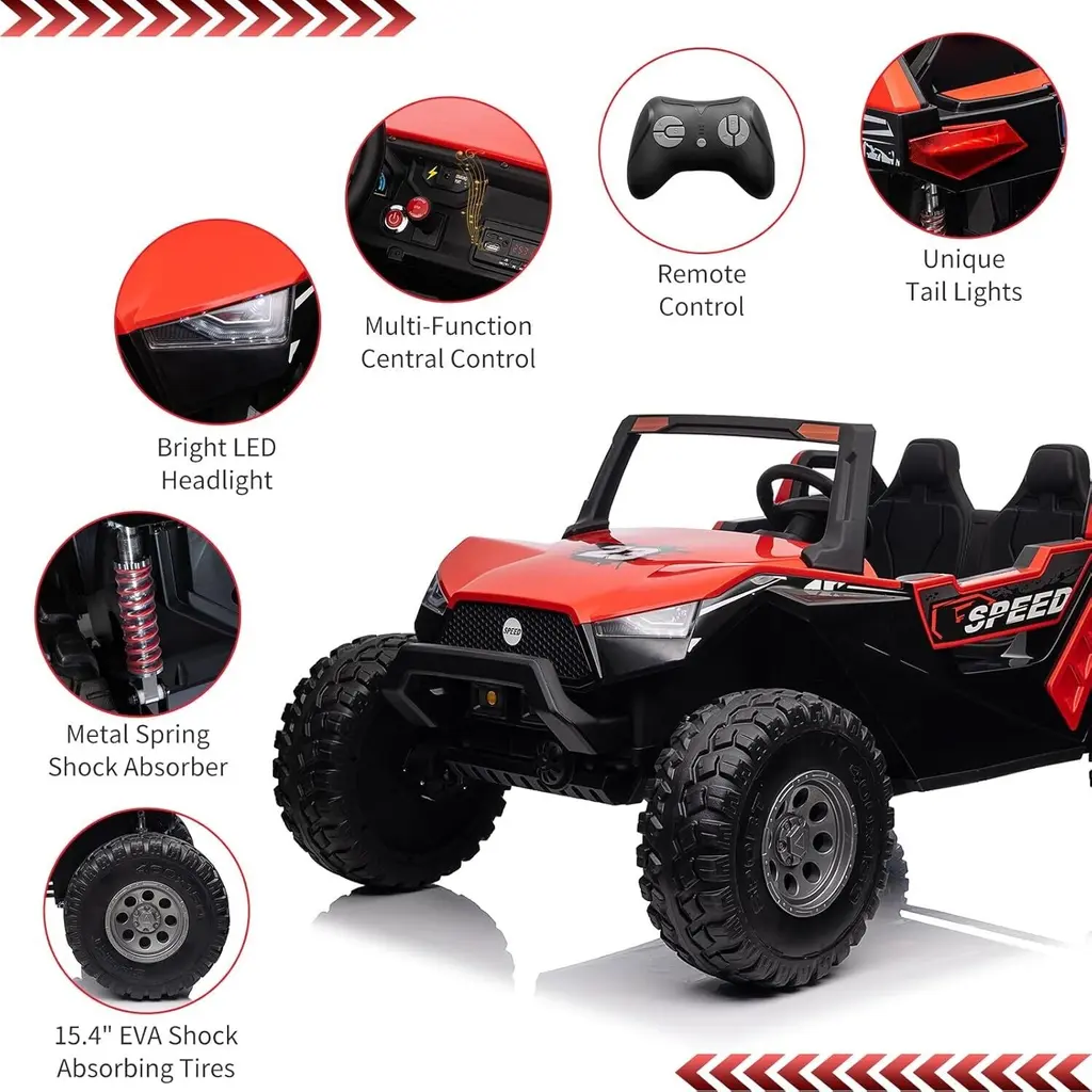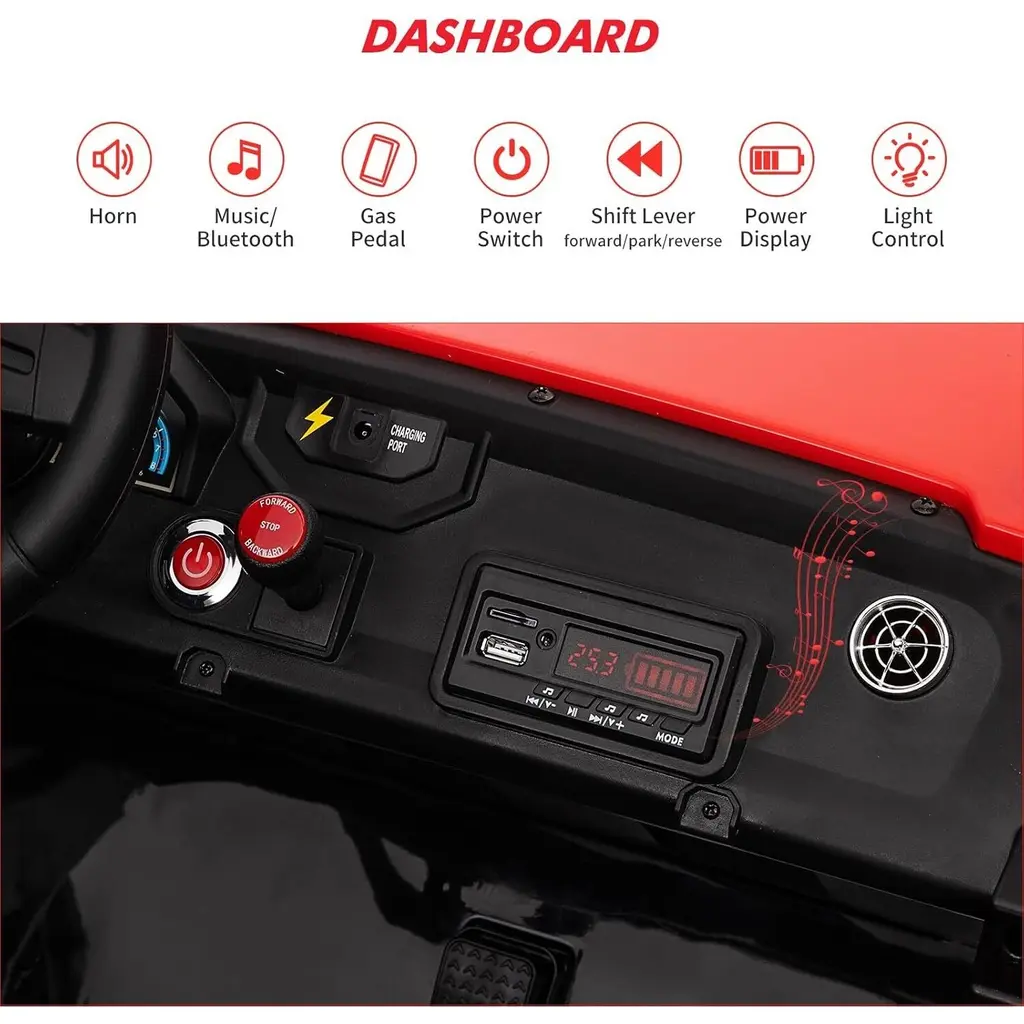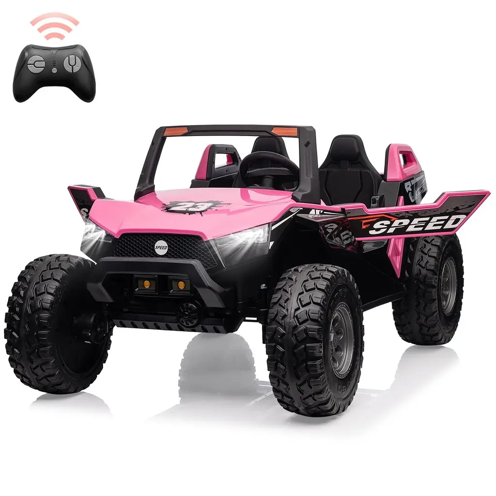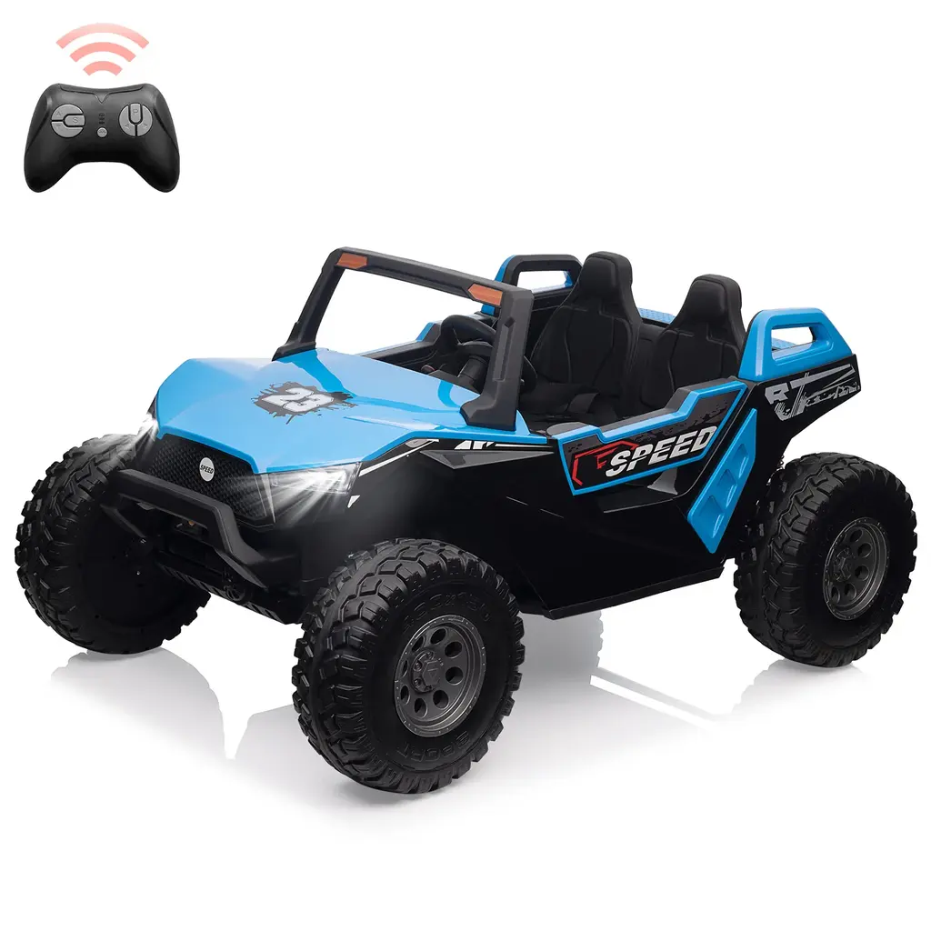 Remote Control and Manual Driving: This 2-seater electric car offers versatile driving options, allowing kids to drive independently using the foot pedal and steering wheel. Parents can also take control with a remote that includes an emergency brake function, ensuring an extra layer of safety during play. Multiple Fun Features: Equipped with a multifunctional music panel, the kids' car allows connection of audio devices via USB, TF card, or AUX port. This feature enables children to enjoy their favorite music while driving, enhancing the overall excitement of their ride. Specially Designed 2+1 Adjustable Seats: The car features adjustable seating for two children aged 3-5 years, with a seat length of 21 inches. An additional foldable small stool is included for older children, accommodating different ages and allowing for cooperative play or supervision while driving. Safety Guarantee: This ride-on UTV is certified by CPSIA and includes a slow start function, parent remote control, adjustable seats with belts, large EVA shock-absorbing tires, and metal spring suspension. These safety features work together to prevent falls and ensure a secure driving experience for children. Best Gift for Kids: Measuring 57.5" x 38.6" x 30", this spacious car supports a maximum load of 140 lbs and offers speeds ranging from 1.8 to 5 mph. Its powerful 24V 7Ah battery provides extended playtime, making it an ideal gift for birthdays, holidays, Christmas, or New Year celebrations. Note: Always supervise children during play and keep them away from hazardous areas such as roads and water.