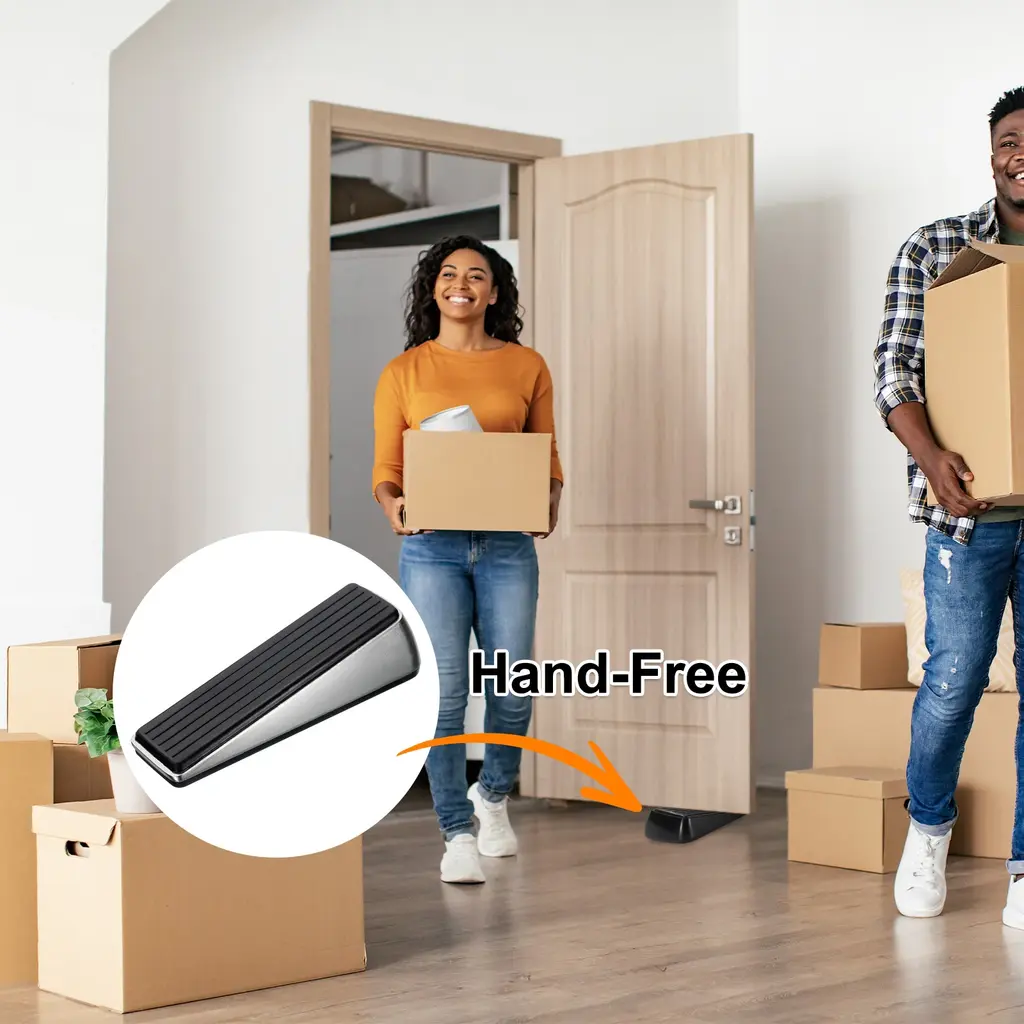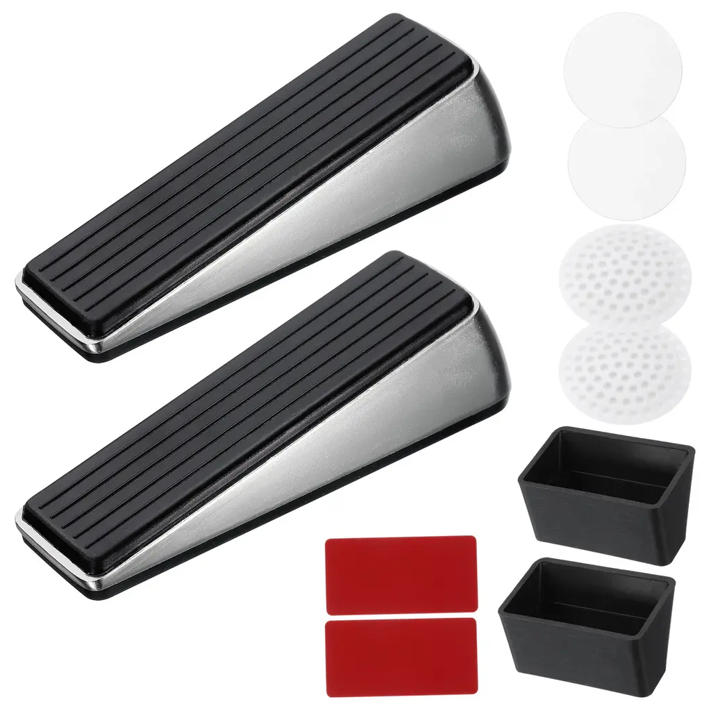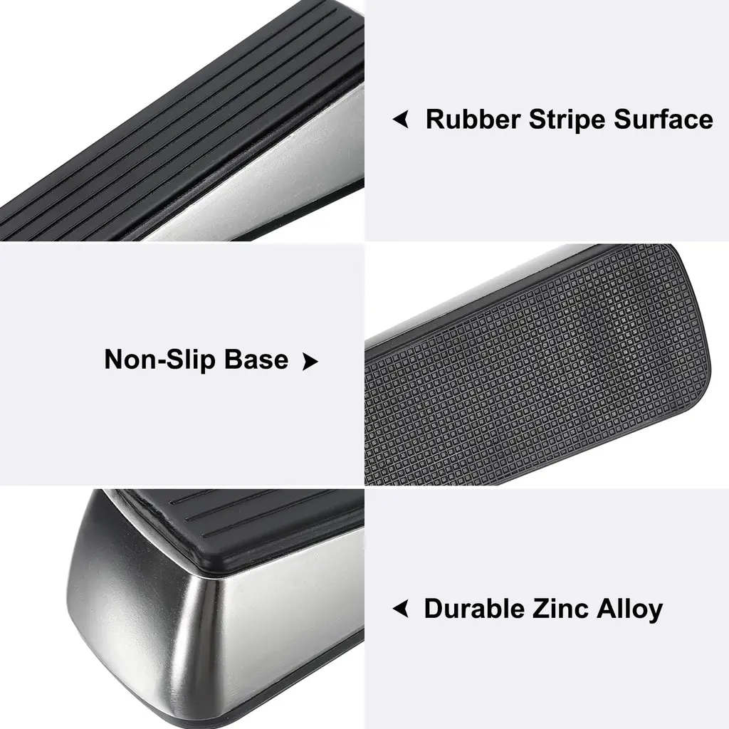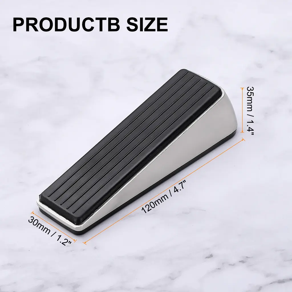 Description:Durable and Reliable: The door stoppers are made of zinc alloy and rubber material, the zinc alloy component offers a sturdy and robust structure, and the rubber bottom provides a good grip for non-slip performance, and effectively holds the doors in place.Good Wedge Door Stopper: The door stops feature a non-slip base to keep the door steady, prevent it from slamming or sliding, prevent accidental locking, and come with wall protectors to prevent any damage or marks on the wall surface.Convenient Use and Storage: Place the zinc and rubber door stop at the desired location on the floor under the door, come with self-adhesive holders that allow for easy and convenient storage behind the door when not in use.Versatile Floor Types: The door stopper wedge can easily keep the doors in the fixed position you want, suitable for use on various floor types including tile, concrete, carpet, wooden floors, and more for homes, offices, hotels, shops, etc.Specification:Material: Zinc Alloy, RubberColor: Silver/BlackTotal Size: 12 x 3.5 x 3 cm / 4.7 x 1.4 x 1.2 inch (L*W*H)Package Contents:2 pcs x Door Stopper2 pcs x Self-Adhesive Holder2 pcs x Self-Adhesive Wall Protectors